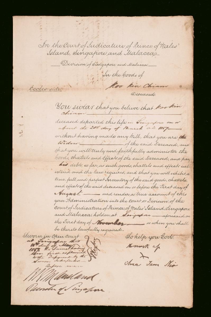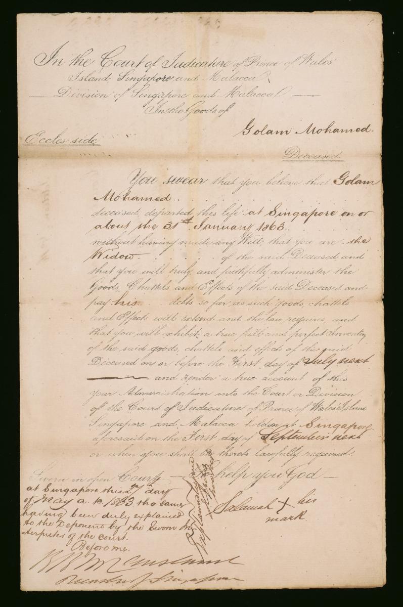 This is an oath sworn by Chea Toh on 9 February 1871 concerning the administration of the estate of Chew Chew Ho. It is part of a collection of legal documents from the 19th and early 20th centuries which provides a glimpse into the work of the notable personalities who left their mark on Singapore’s legal history, and the economic and other transactions undertaken by ordinary immigrants in 19th century Singapore that tell stories of misfortune and indebtedness which would otherwise have disappeared from history.