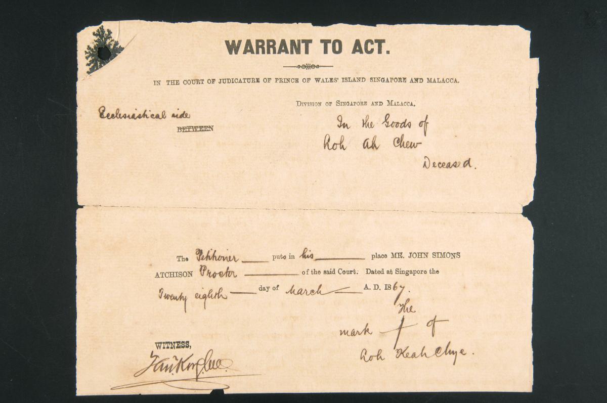 This is a warrant to act issued by Loh Pek Neo on 18 February 1870 concerning the administration of the estate of the deceased See Kwan. It is part of a collection of legal documents from the 19th and early 20th centuries which provides a glimpse into the work of the notable personalities who left their mark on Singapore’s legal history, and the economic and other transactions undertaken by ordinary immigrants in 19th century Singapore that tell stories of misfortune and indebtedness which would otherwise have disappeared from history.