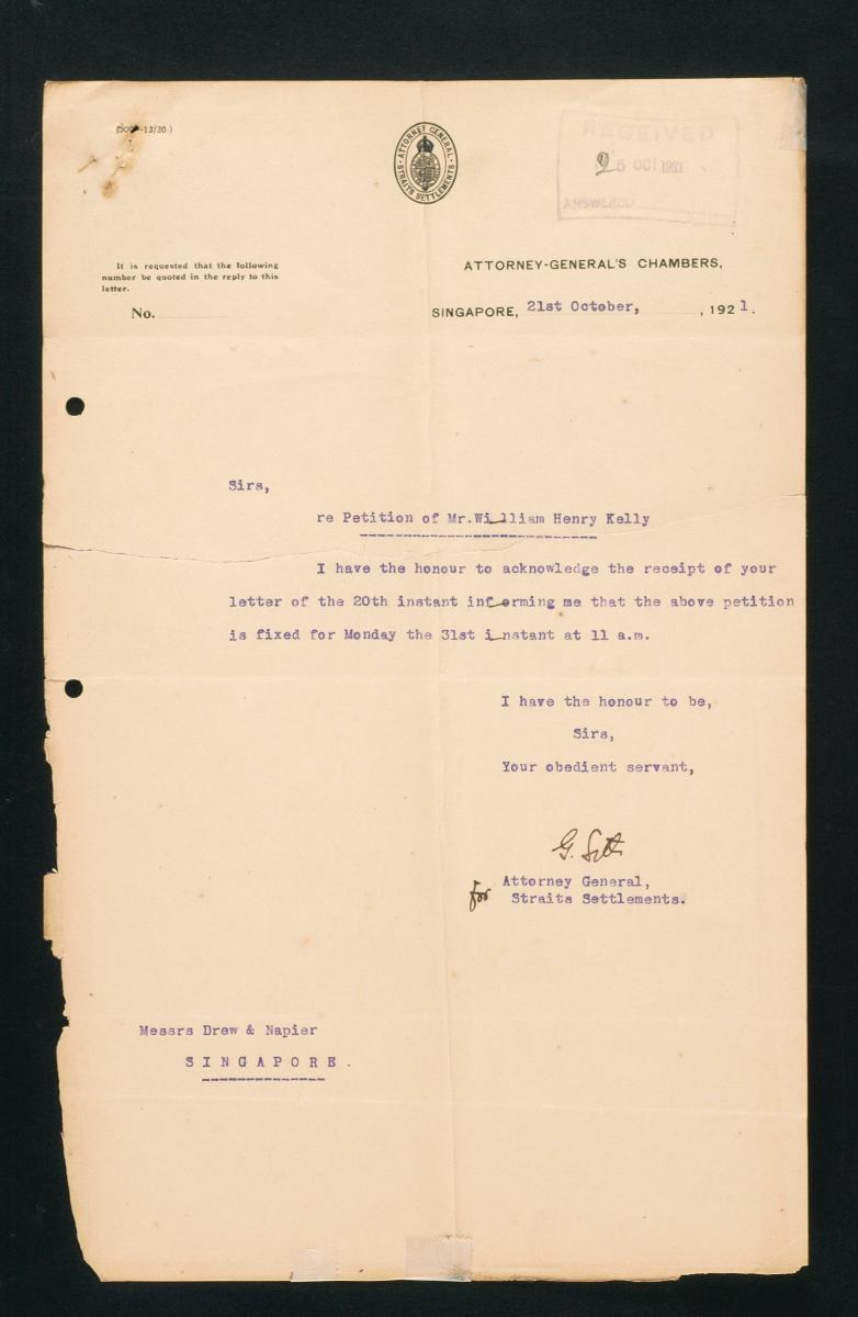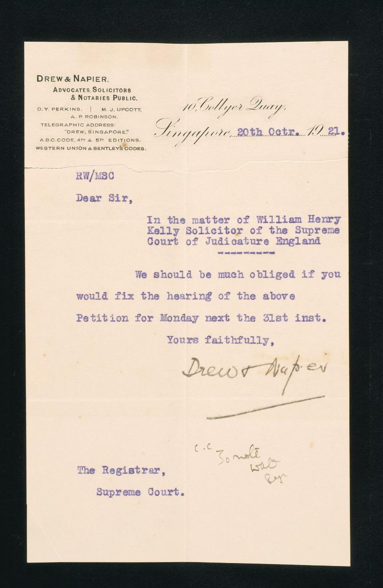 This is a letter dated 30 June 1922 sent on behalf of the Acting Attorney General of the Supreme Court of the Straits Settlements to Drew and Napier, concerning the hearing of the petition of John Cecil Rash for his admission as a solicitor and advocate to the Court. It is part of a collection of legal documents from the 19th and early 20th centuries which provides a glimpse into the work of the notable personalities who left their mark on Singapore’s legal history, and the economic and other transactions undertaken by ordinary immigrants in 19th century Singapore that tell stories of misfortune and indebtedness which would otherwise have disappeared from history.