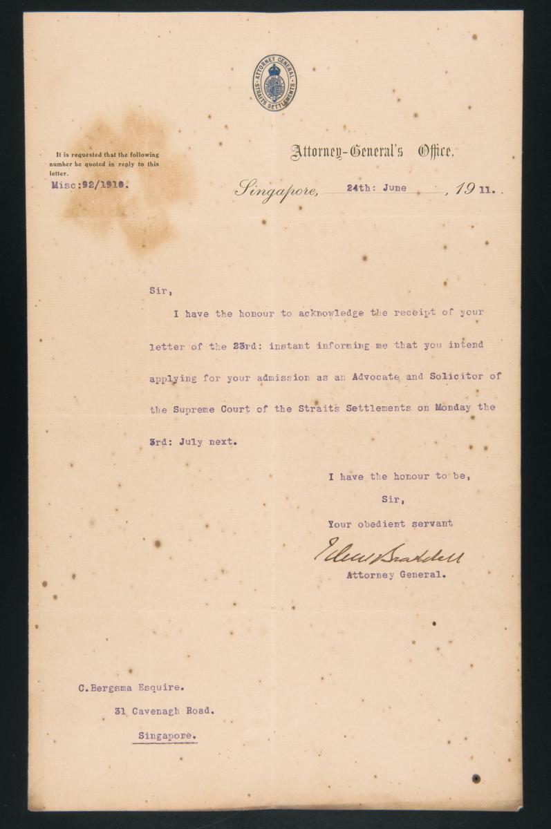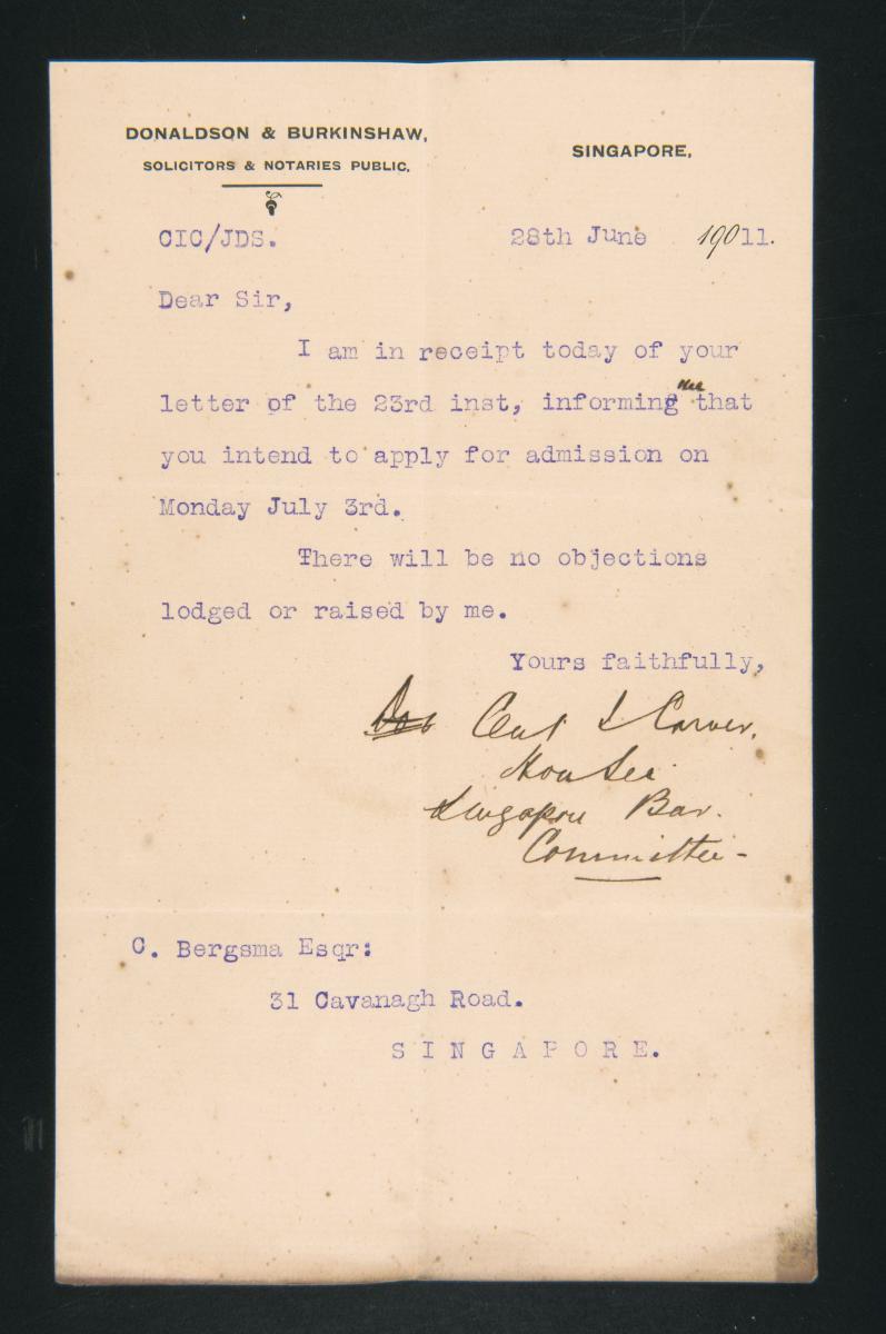 This is a testimonial dated 8 December 1910 for Cornelis Adrian Bergsma from his cousin, Cornelis Adriaan Bergsma, judge of the Court of Justice, Raad van Justitie, at Medan-Deli, Sumatra. It is part of a collection of legal documents from the 19th and early 20th centuries which provides a glimpse into the work of the notable personalities who left their mark on Singapore’s legal history, and the economic and other transactions undertaken by ordinary immigrants in 19th century Singapore that tell stories of misfortune and indebtedness which would otherwise have disappeared from history.
