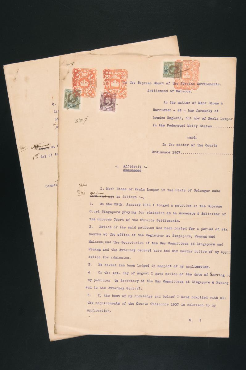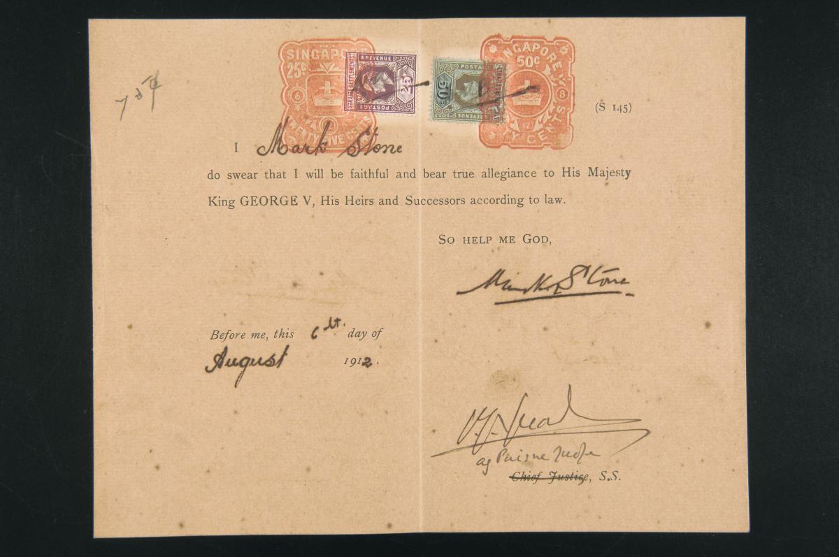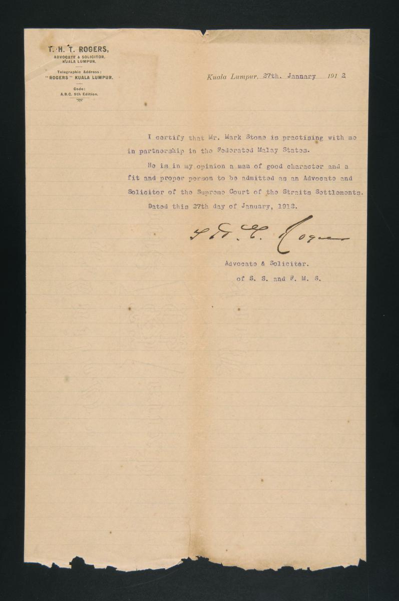 This is a testimonial for Mark Stone dated 27 January 1912. It is part of a collection of legal documents from the 19th and early 20th centuries which provides a glimpse into the work of the notable personalities who left their mark on Singapore’s legal history, and the economic and other transactions undertaken by ordinary immigrants in 19th century Singapore that tell stories of misfortune and indebtedness which would otherwise have disappeared from history.