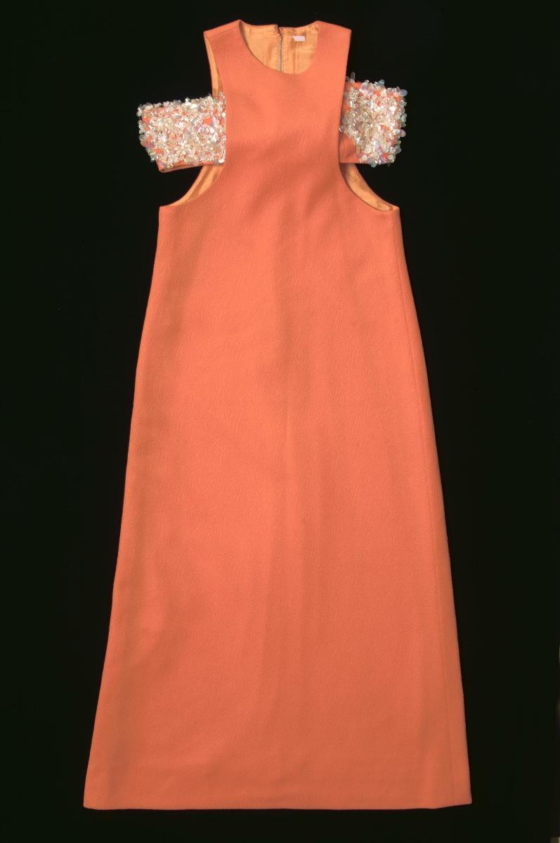 This Andre Courreges pink mini dress with two front pockets bears both the Courreges Paris and Harrods London labels. Mini dresses and skirts first appeared in the 1960s and were influenced by the fashion of the youths. According to some scholars, it was Andre Courreges who created the mini in 1965. Courreges (b. 1923) belonged to the group of designers who designed eye-catching and futuristic clothes in the 1960s.