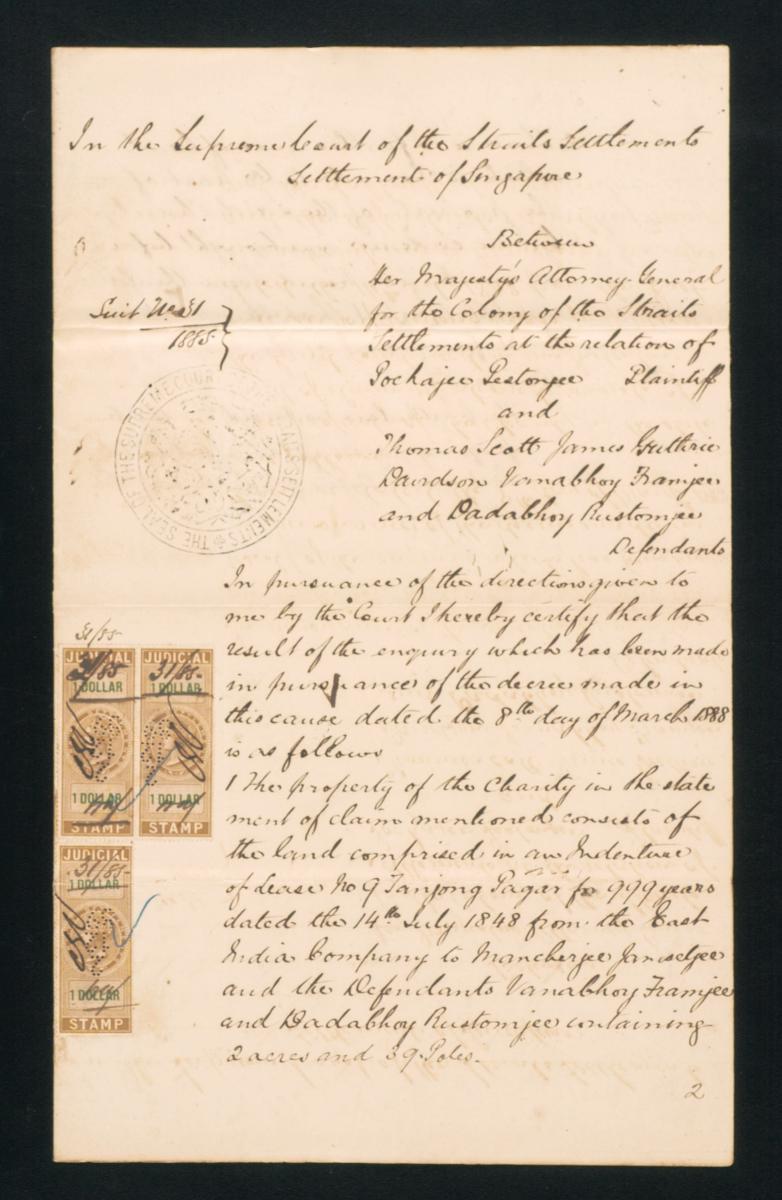 This is a document issued on 23 March 1885 concerning the suit between the Attorney General at the relation of Pochajee Pestorjee (plaintiff) and Thomas Scott, James Guthrie Davidson, Vomabhoy Bamjee and Dadabhoy Rustomjee (defendants). It is part of a collection of legal documents from the 19th and early 20th centuries which provides a glimpse into the work of the notable personalities who left their mark on Singapore’s legal history, and the economic and other transactions undertaken by ordinary immigrants in 19th century Singapore that tell stories of misfortune and indebtedness which would otherwise have disappeared from history.
