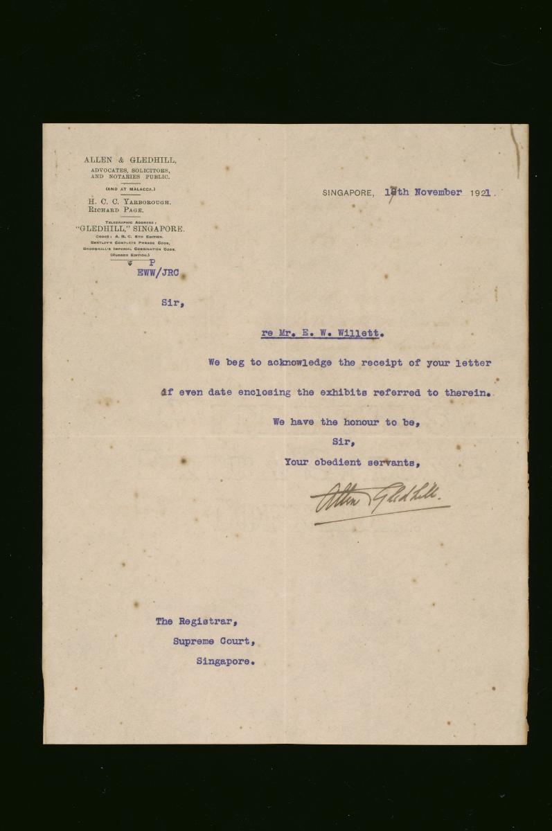 This is an inquiry dated 10 July 1912 from Mark Stone to the Registrar of the Supreme Court of the Straits Settlements, Settlement of Singapore, concerning the date of the hearing of his petition for admission as a solicitor and advocate to the Supreme Court. It is part of a collection of legal documents from the 19th and early 20th centuries which provides a glimpse into the work of the notable personalities who left their mark on Singapore’s legal history, and the economic and other transactions undertaken by ordinary immigrants in 19th century Singapore that tell stories of misfortune and indebtedness which would otherwise have disappeared from history.