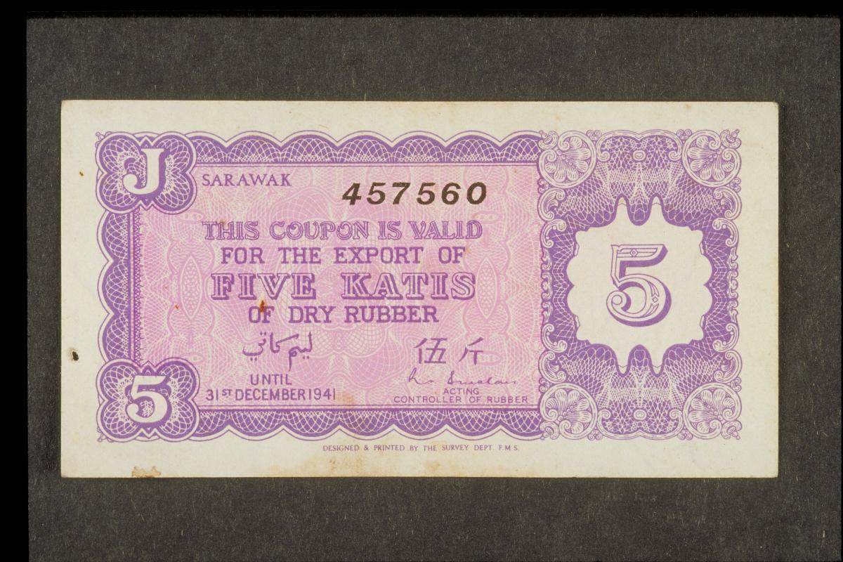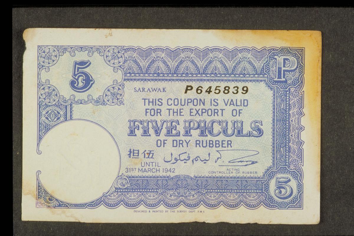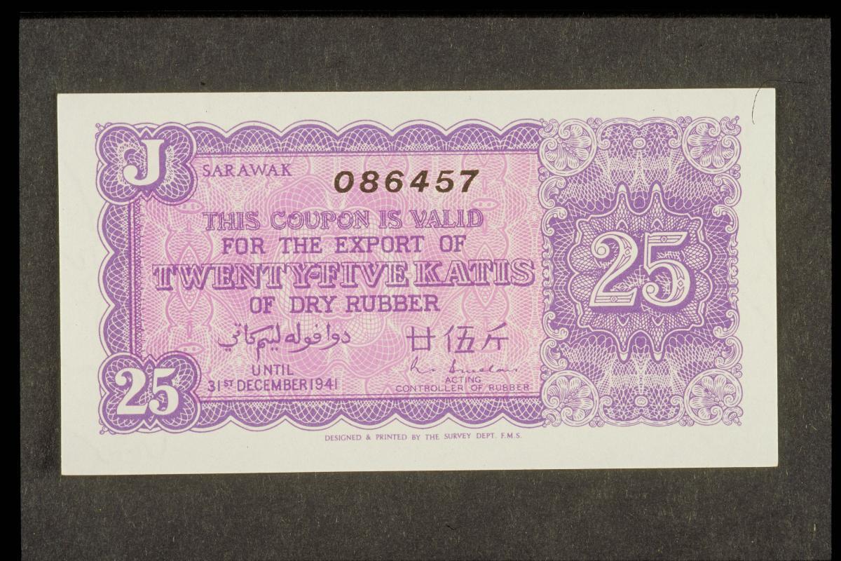 This is a rubber export coupon. During the Great Depression, the price of rubber in Southeast Asia fell drastically due to overproduction. In order to protect the rubber industry (or more specifically, to protect the European rubber companies against native rubber owners) in Malaya, Borneo and the East Indies, the British and Dutch imposed a restriction on the export of rubber. From 1922 to 1941, the British issued coupons to native rubber owners in Malaya and the Federated Malay States (FMS). These coupons gave the owners the right to export a certain percentage of their total rubber production (coupons reflected the specific quantity, ranging from 'katis' to 'piculs'). Very quickly, forged coupons flooded the market and in desperation, the Federal Government commissioned Thomas De La Rue, an expert in producing banknotes and postage stamps, to produce the coupons. This, unfortunately, did not produce the desired outcome and forged coupons remained on the market.