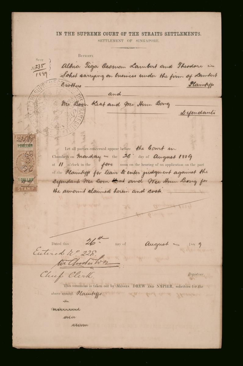 This is the writ of summons issued on 25 June 1889 concerning the suit between Alhia Tiga Oesman Lambert and Theodore Sohet carrying out business under the Lambert Brothers (plaintiffs) and Wee Boon Keat and Wee Thum Beng (defendants). These summons were filed by the solicitors for the plaintiffs, Drew and Napier. This document is part of a collection of legal documents from the 19th and early 20th centuries which provides a glimpse into the work of the notable personalities who left their mark on Singapore’s legal history, and the economic and other transactions undertaken by ordinary immigrants in 19th century Singapore that tell stories of misfortune and indebtedness which would otherwise have disappeared from history.