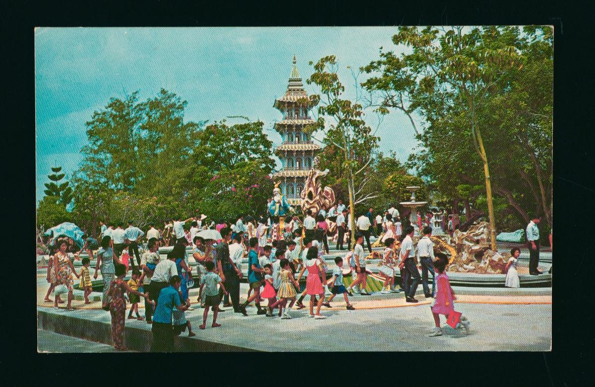Sculptures and statues aside, kiosks and pavilions with intricate designs such as the one seen in this photograph were also a mainstay at Haw Par Villa, which showcased the theme of Chinese legend and folklore in most of its displays. Originally called Tiger Balm Gardens, Haw Par Villa was built on Pasir Panjang Road by Aw Boon Haw in 1937. A prominent businessman and philanthropist, Aw had set up the gardens with the intention of educating the public about Chinese culture. Lying on the right side in the background of this image is a structure that was erected in memory of Aw’s younger brother, Boon Par, who died in 1944. The Aw brothers were synonymous with Tiger Balm, the renowned ointment for aches and pains, which they successfully marketed in Singapore and around the region during the early 20th century.