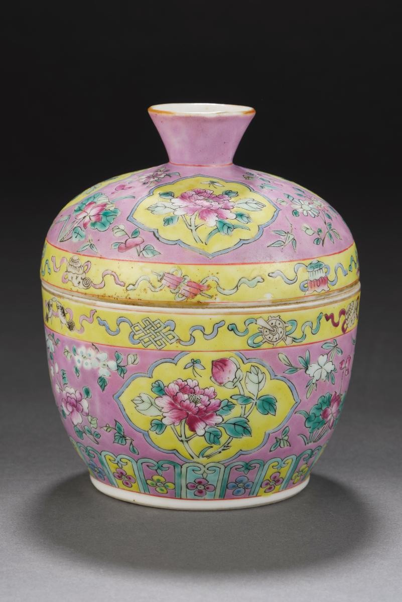 A range of tiny jewel-like porcelain jars and boxes such as miniaturised ‘kamcheng’ and ‘chupu’ (covered jars) would have been included in an affluent Peranakan Chinese bride’s wedding gifts. These would have been displayed on the bride’s dressing table along with other personal items.This miniature ‘chupu’ may have been used by the Nyonya (Peranakan woman) as a cosmetic container to hold a type of face powder known as 'bedak sejuk' (literally, cooling powder in Malay), made from finely ground rice flour. It may have also been used to store small trinkets.