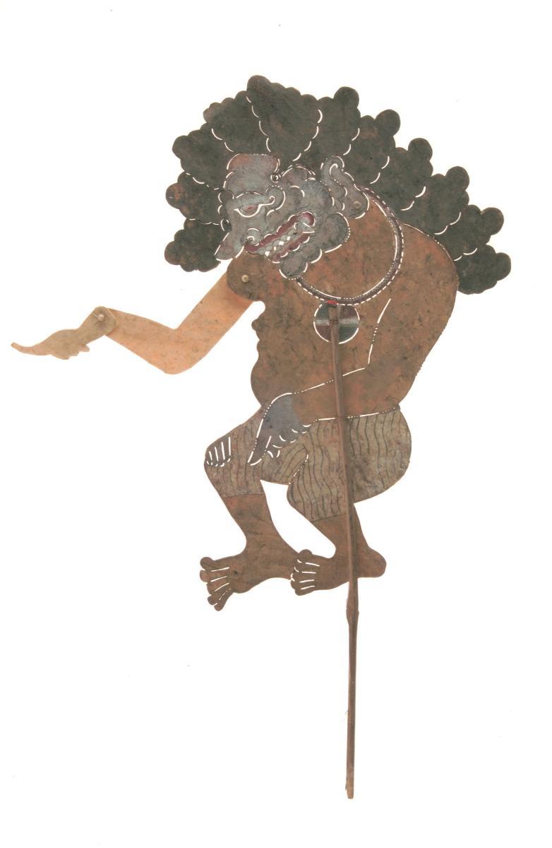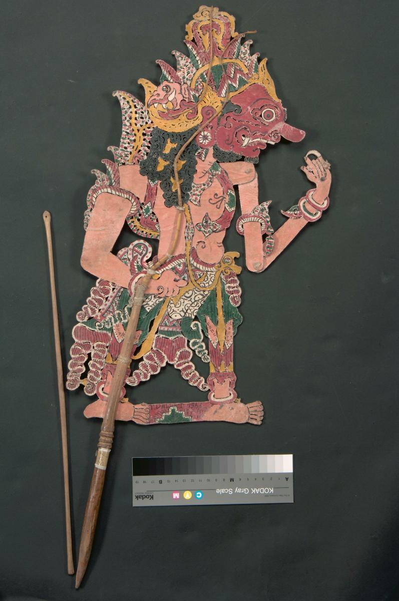 This mask represents one of the main characters from the Khmer version of the Ramayana, the Reamker story that supports the all-male dance-drama tradition (lakhaoun khaol). The ogre characters that rule in khaol tradition are seen in the multi-headed Krong Reap (Ravana).Masks were used in various Khmer dance traditions including lakhaoun luong (court dance) and lakhaoun khaol. It is made by moulding layers of paper in two halves which are then joined together. Decorative elements are moulded in wax and applied to the mask, which is then painted and gilded with gold leaf. This mask is made by An Sok, one of the last master lacquer craftsmen in Phnom Penh.Commissions such as this help to sustain living traditions. It is thought that this set of masks could well be the most comprehensive set to have been made by Mr. An Sok who passed away recently.