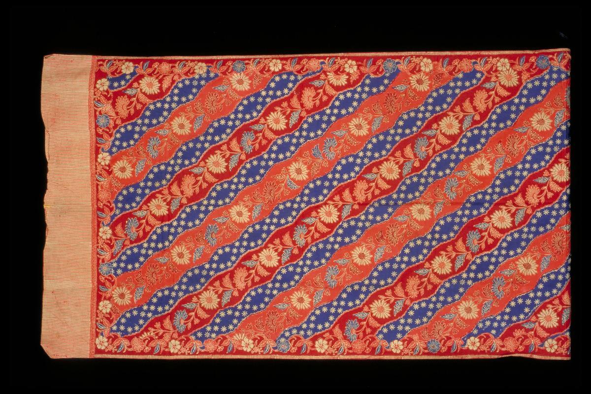 This red floral ‘selendang’ (shoulder cloth) belonged to former First Lady, Puan Noor Aishah, the wife of Singapore’s first President, Mr. Yusof Ishak. Puan Noor Aishah would buy fabrics from Arab Street or High Street and make her own ‘selendang’ and clothes. She is often depicted in photographs wearing the ‘sarong kebaya’ (an open tunic fastened with brooches worn with a sarong) with a ‘selendang’ draped over her shoulders.