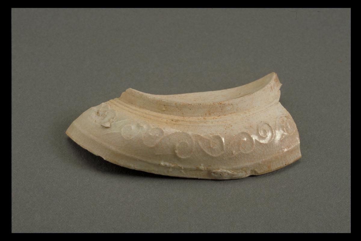 This shard was previously part of a Dehua porcelain bowl. It is decorated with moulded scroll designs and has a crazed white glaze. The bowl which this shard is a part of might be classified under ‘southern provincial wares’ or ‘minan ware’ (wares produced in south Fujian). These wares were made for domestic use or for export and their quality is generally of a lower standard.