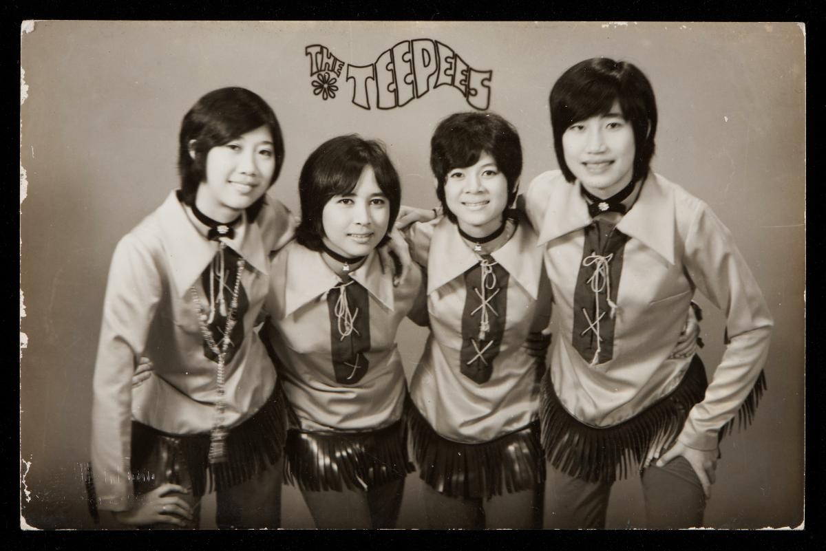 This is believed to be a ‘dondang sayang’ (love ballad/musical) group. The men sitting on the far left and far right are carrying a ‘rebana’ (hand drum), which is placed on the player’s lap during a performance. The man second from the left is holding a violin. The two women sitting in the middle are wearing traditional Malay dresses.