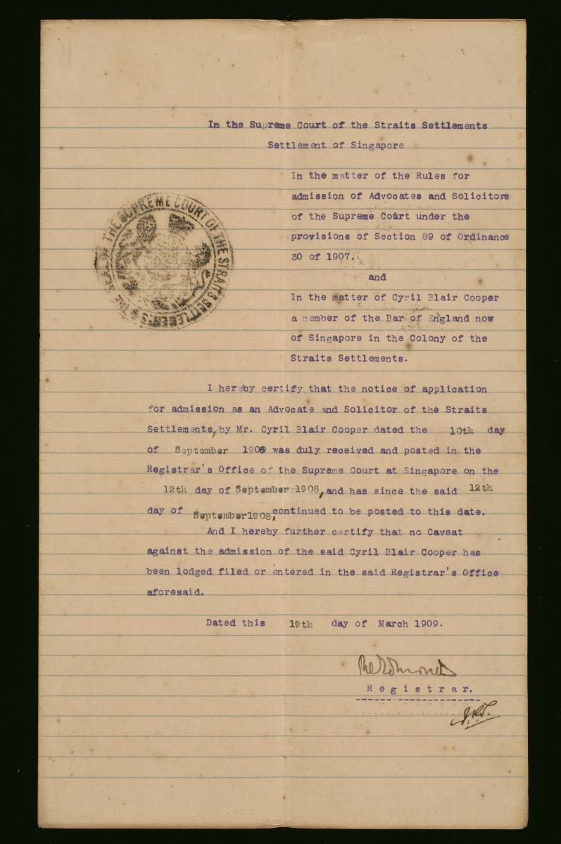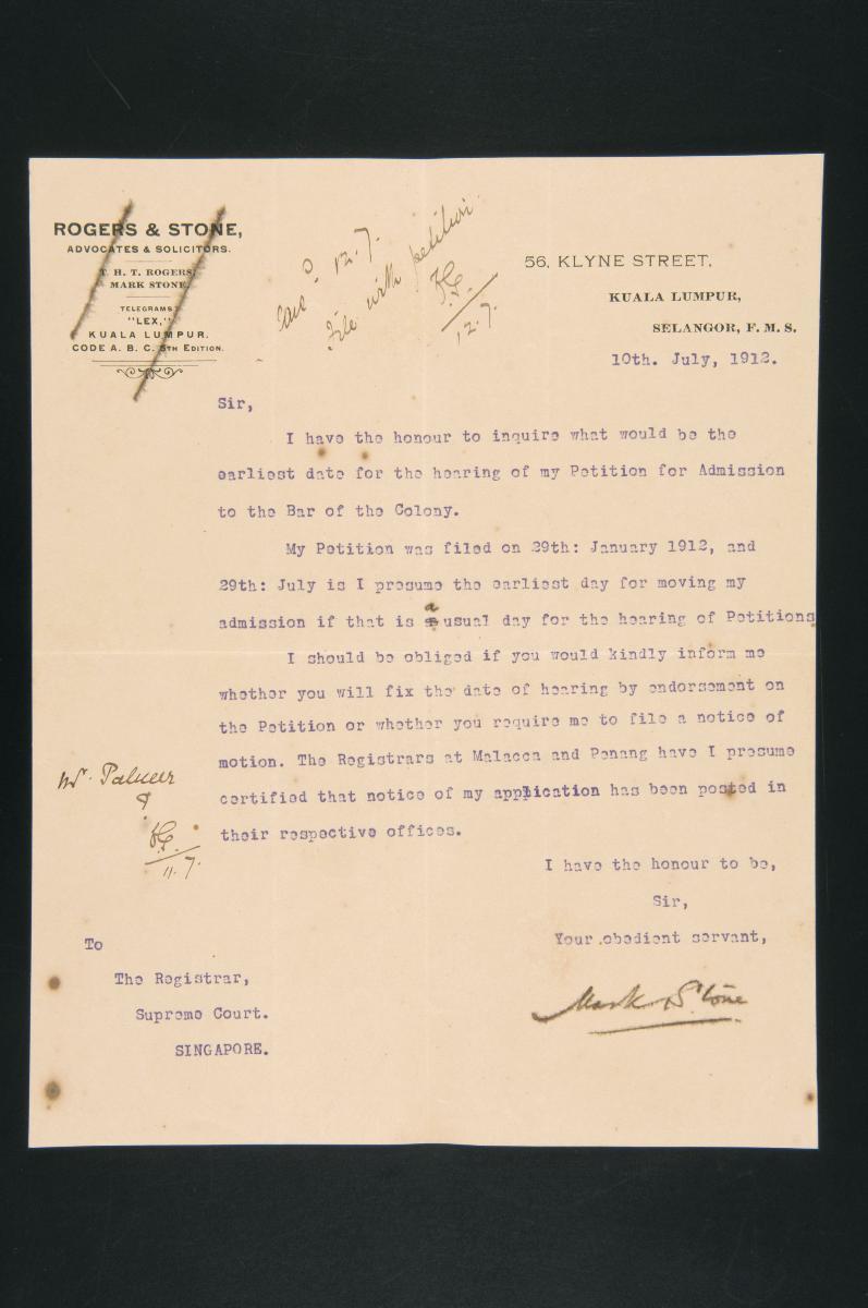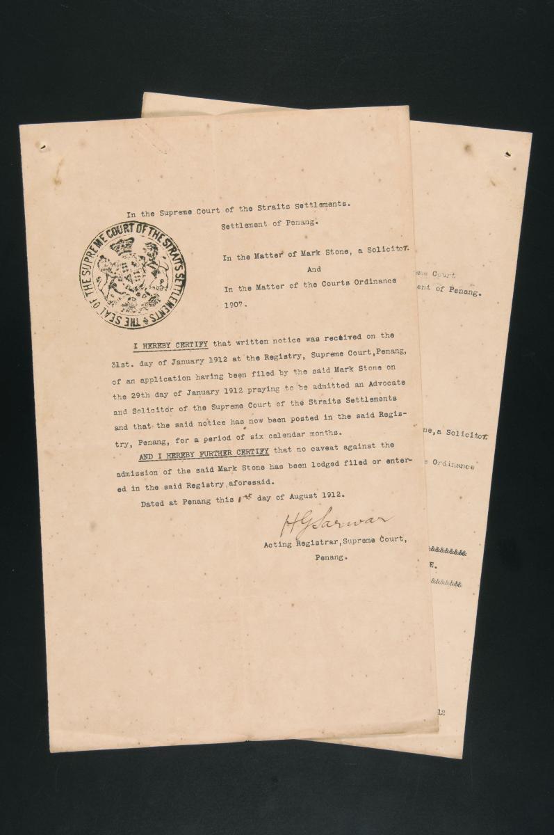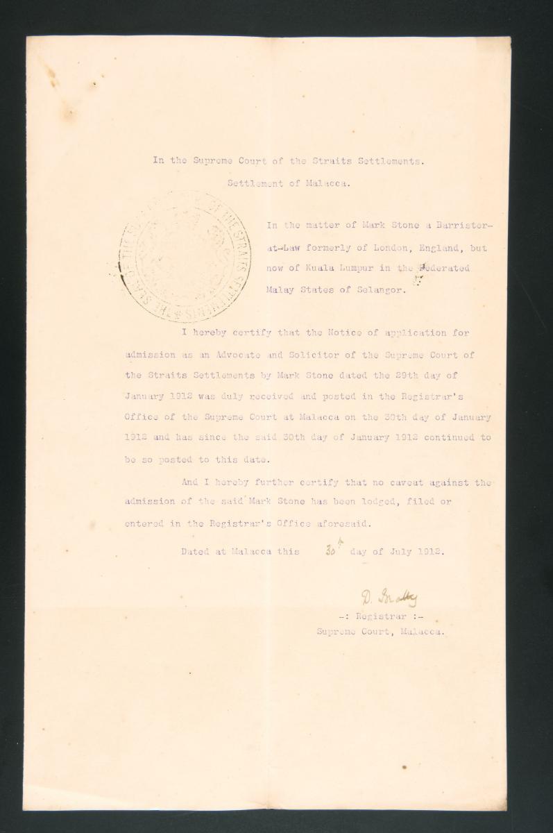 This is a registrar's certificate issued on 6 August 1912 by the Registrar of the Supreme Court of the Straits Settlements, Settlement of Singapore, concerning the petition of Mark Stone for admission as a solicitor and advocate to the Supreme Court. It is part of a collection of legal documents from the 19th and early 20th centuries which provides a glimpse into the work of the notable personalities who left their mark on Singapore’s legal history, and the economic and other transactions undertaken by ordinary immigrants in 19th century Singapore that tell stories of misfortune and indebtedness which would otherwise have disappeared from history.