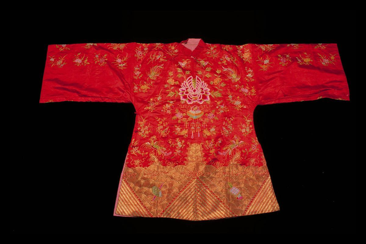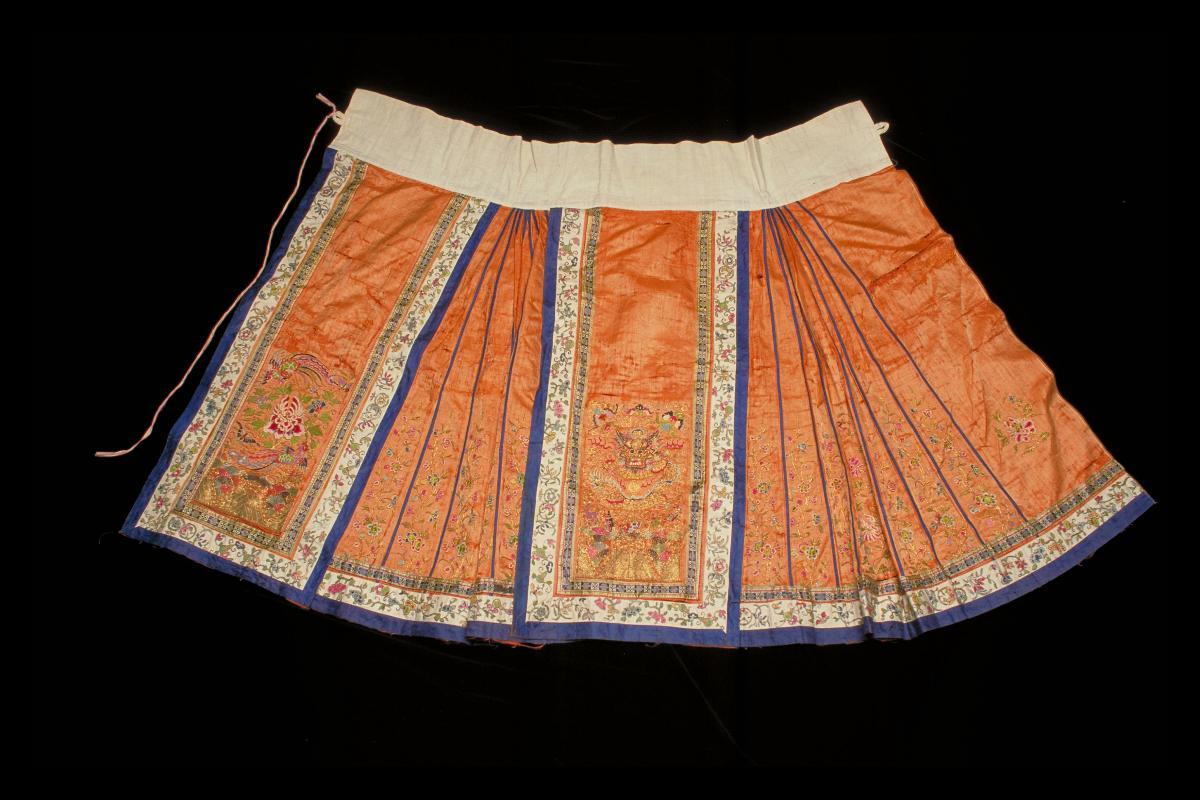 This skirt is the bottom half of an outfit which is worn by the Peranakan Chinese bride on the third day of the 12-day wedding ceremony. The skirt features auspicious floral, butterfly and phoenix motifs typically found on Peranakan Chinese wedding garments.
