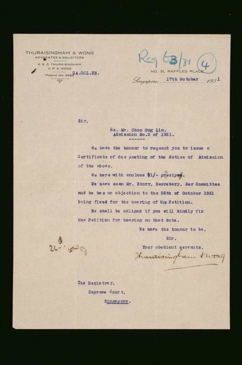 This is a request dated 10 December 1930 from Drew and Napier to the Registrar of the Supreme Court of the Straits Settlements in Singapore, concerning John Cecil Rash's admission to practice in the Courts here in 1922. This document is part of a collection of legal documents from the 19th and early 20th centuries which provides a glimpse into the work of the notable personalities who left their mark on Singapore’s legal history, and the economic and other transactions undertaken by ordinary immigrants in 19th century Singapore that tell stories of misfortune and indebtedness which would otherwise have disappeared from history.