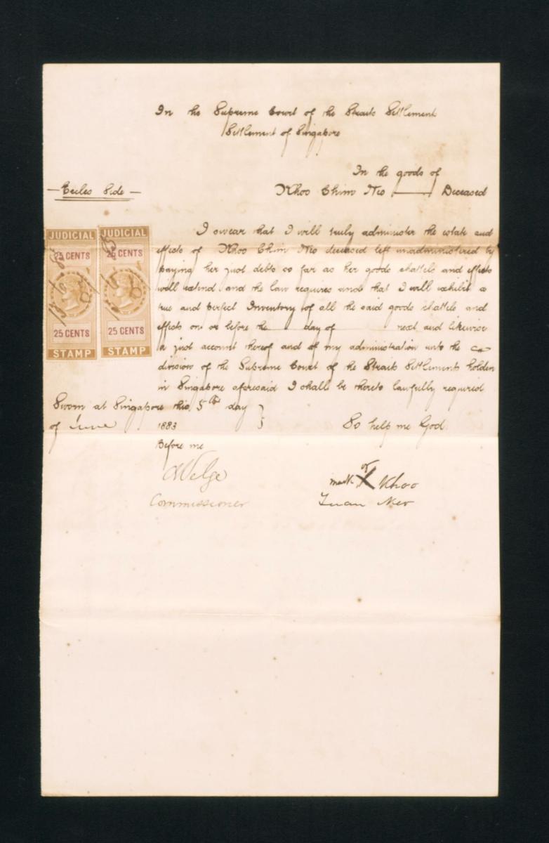 This is an oath dated 31 October 1876 sworn by Lim Kim Neo of Singapore concerning the administration of the estate of the deceased Tan Peck Hock. It is part of a collection of legal documents from the 19th and early 20th centuries which provides a glimpse into the work of the notable personalities who left their mark on Singapore’s legal history, and the economic and other transactions undertaken by ordinary immigrants in 19th century Singapore that tell stories of misfortune and indebtedness which would otherwise have disappeared from history.