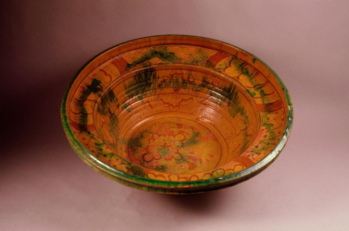 This impressive piece of metalwork was produced in Khurasan, Persia (present-day Iran) in the 12th century. This round basin has a flaring foliated rim and the centre of the basin features panels of scrolling vines around silver-inlaid crescent roundels and a narrow band of repeated inscription in kufic script. The sides have a broad band of repeated inscriptions in naskh script with human heads on the end of vertical letters. The inscriptions are benedictory.This metal basin features a combination of calligraphy and geometric as well as scrolling designs - the three important forms of Islamic artistic expression.
