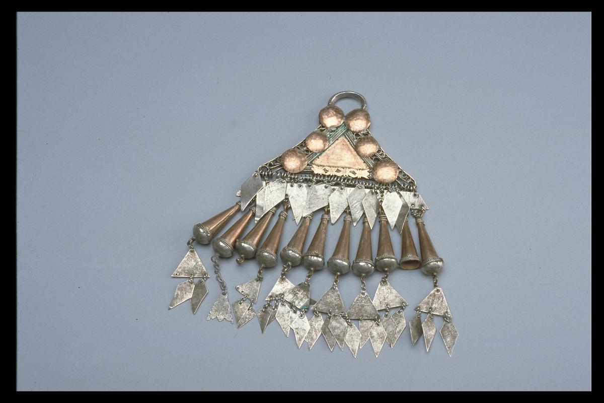 This large wedding nape ornament or necklace has gold sheathing and decorated with low relief repousse. It is part of a set of wedding jewellery and headdress worn by a Minangkabau bride and which is also worn during formal occasions. Considered as 'pusako' or heirloom jewellery and owned by the matrilineage, they may be borrowed for ceremonial occassions by family members of the same lineage and must always be returned after use.