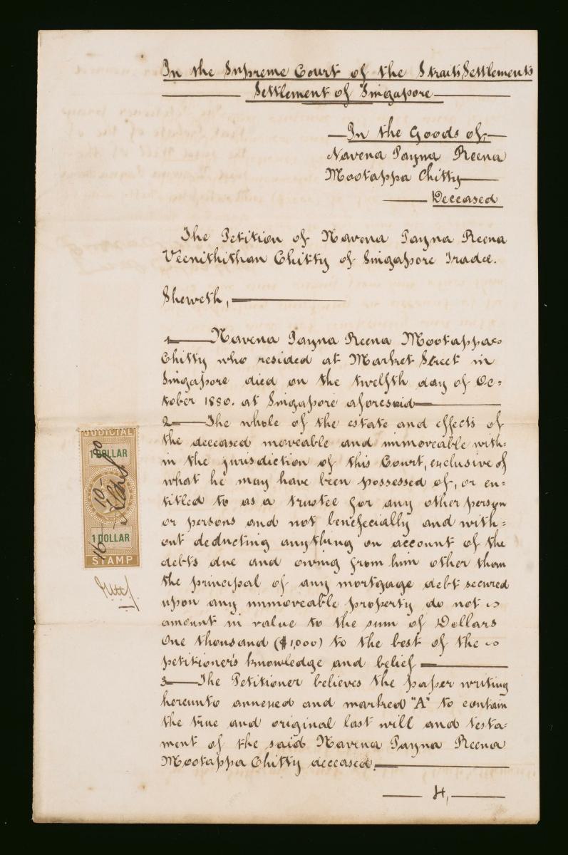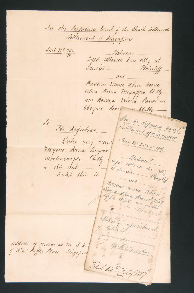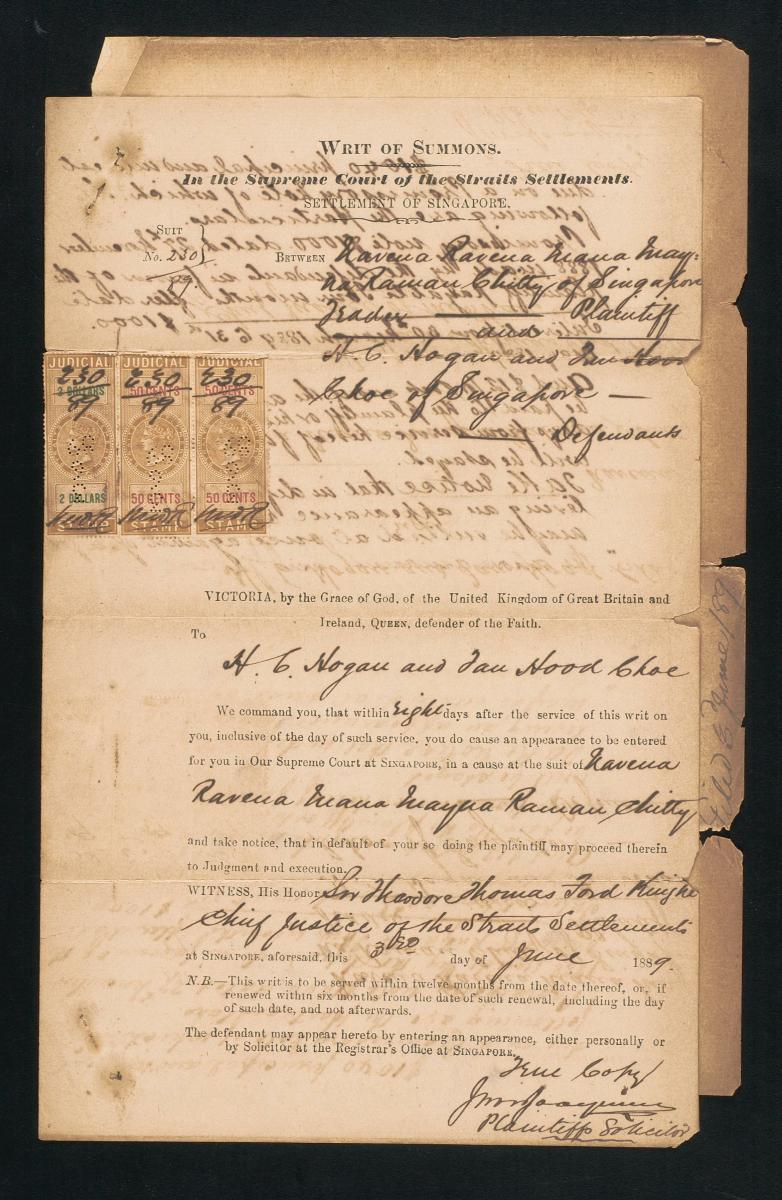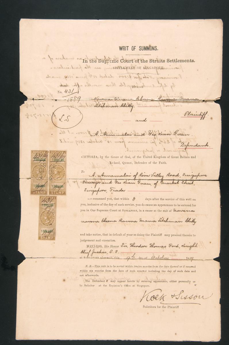 This is a writ of summons issued on 20 June 1885 to Mayna Payna Reena Vellyappa Chitty, the defendant in the suit against the New Harbour Dock Company Limited. It is part of a collection of legal documents from the 19th and early 20th centuries which provides a glimpse into the work of the notable personalities who left their mark on Singapore’s legal history, and the economic and other transactions undertaken by ordinary immigrants in 19th century Singapore that tell stories of misfortune and indebtedness which would otherwise have disappeared from history.