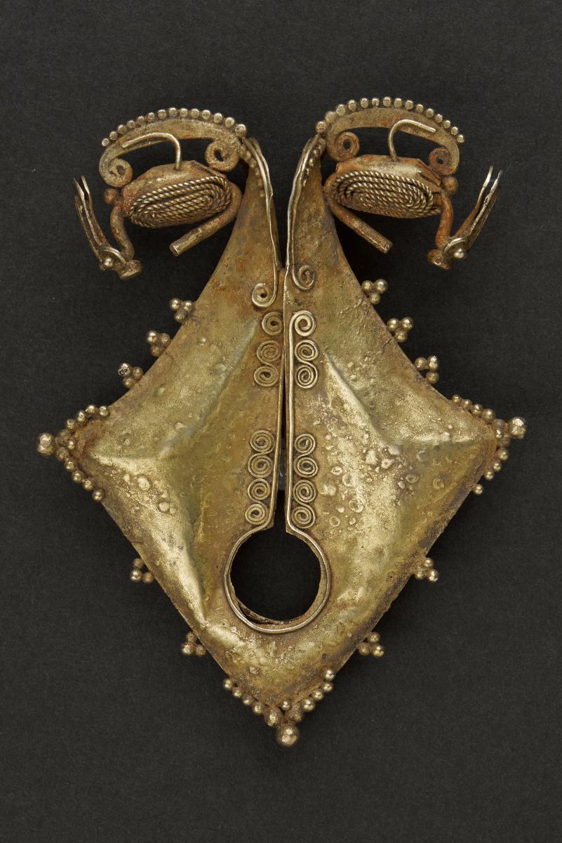 The earliest Central Javanese (post classical) sometimes used a layer of silver over gold in order to enhance the glitter of the rough cut diamonds. It was only with the coming of the Europeans that the Javanese learnt how to cut diamonds, leading to the spectacular 'berlian' (brilliant cut) jewellery of later periods.This piece comes from that early period and the use of the Dutch lion is also an important indicator of European contact and shows the close alliance between the two groups.The piece is believed to have come from a princess in the Solo court.