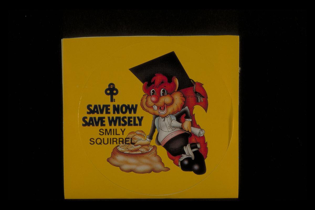 ‘Smiley Squirrel’ sticker with slogan, ‘Save now, save wisely’