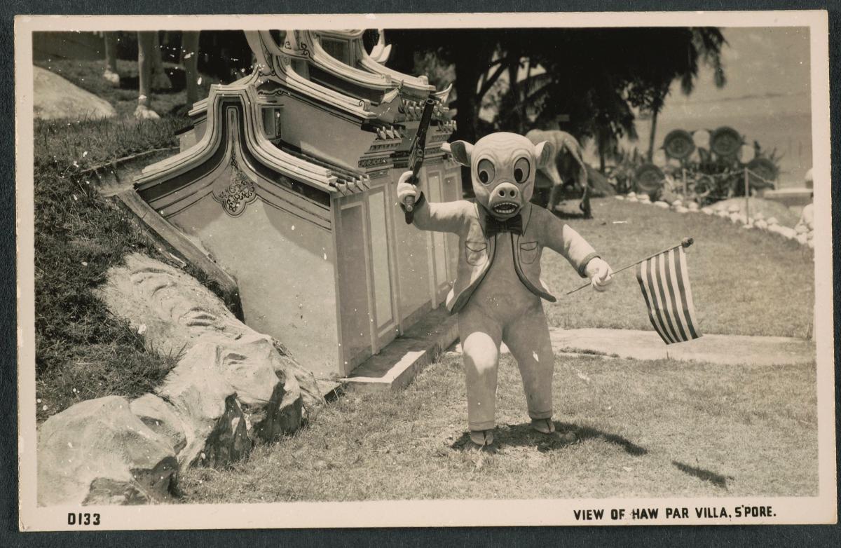 Apart from themes illustrating Chinese folklore and legend, hundreds of animal sculptures can also be seem throughout Haw Par Villa. This particular display showcases two large rabbits with a cartoon character sitting on top of each of them.