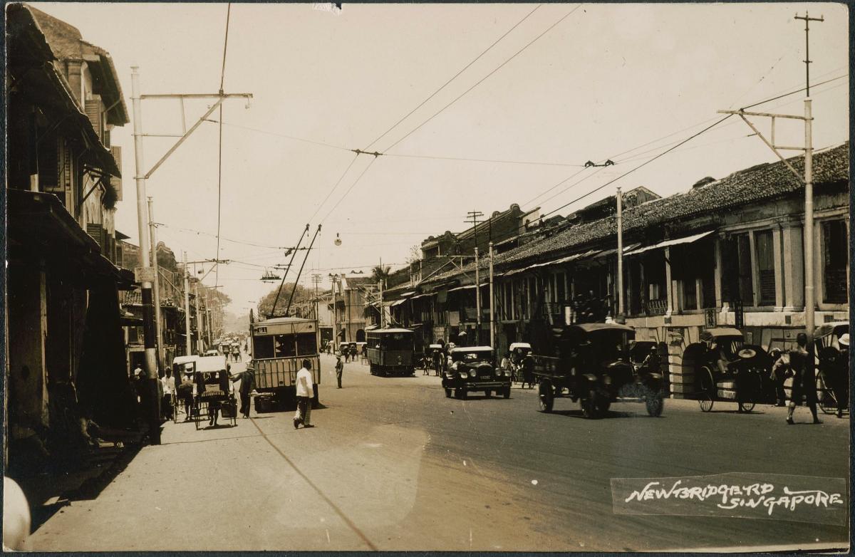 This shot of a crowded New Bridge Road was taken from the Singapore River near Coleman Bridge, showing rickshaw pullers heading west towards Chinatown.