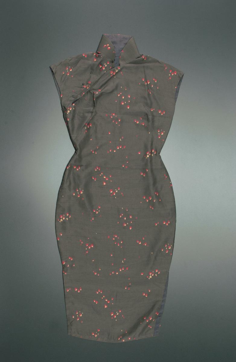 This red floral ankle length cheongsam with long sleeves belonged to Mdm Zhuo Yu Chun, director of Tai Wee Company Pte Ltd. Made of satin silk, it has red and gold piping and gold floral buttons. It is most probably meant for more formal and joyous occasions because the overall look of this cheongsam is rather luxurious.