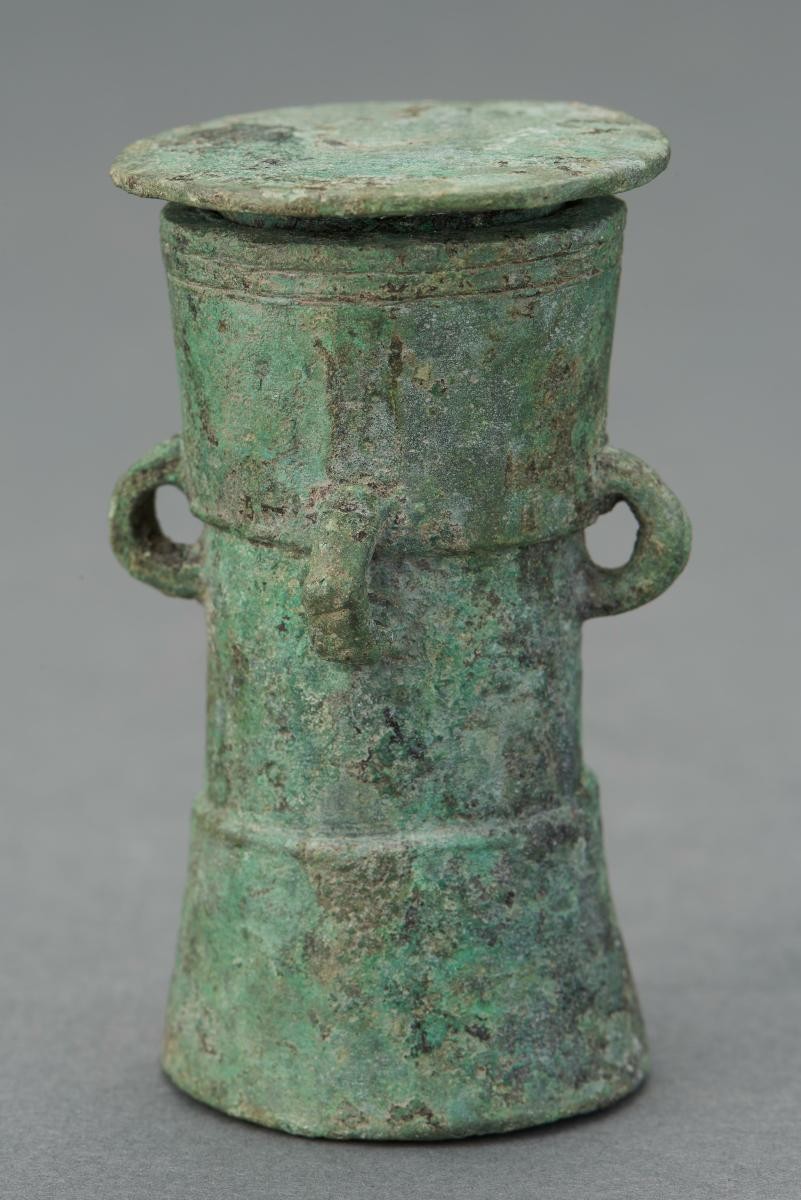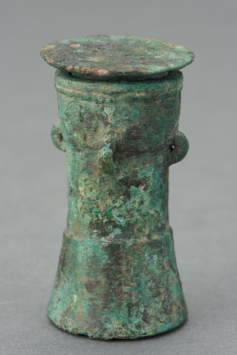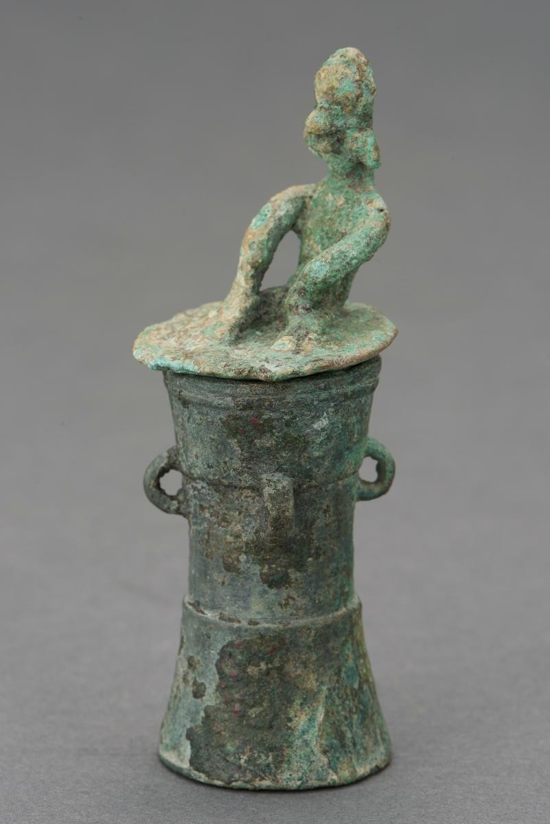 This bronze lime container in the shape of a stylised bird has raised geometric decoration on the body and the pedestal it stands on. The lime container was reportedly found in Central Java and dates to the 1st century CE, representing the long bronze-casting tradition of the Dong Son and its dispersal over a wide area.The limepot, associated with the ancient practice of betel chewing, was used to store powdered lime, which together with areca nut and betel leaf formed a chewing quid.