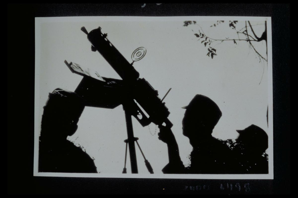 Japanese Occupation in Shanghai - A Chinese soldier points his machine gun skywards as his fellow comrade looks up