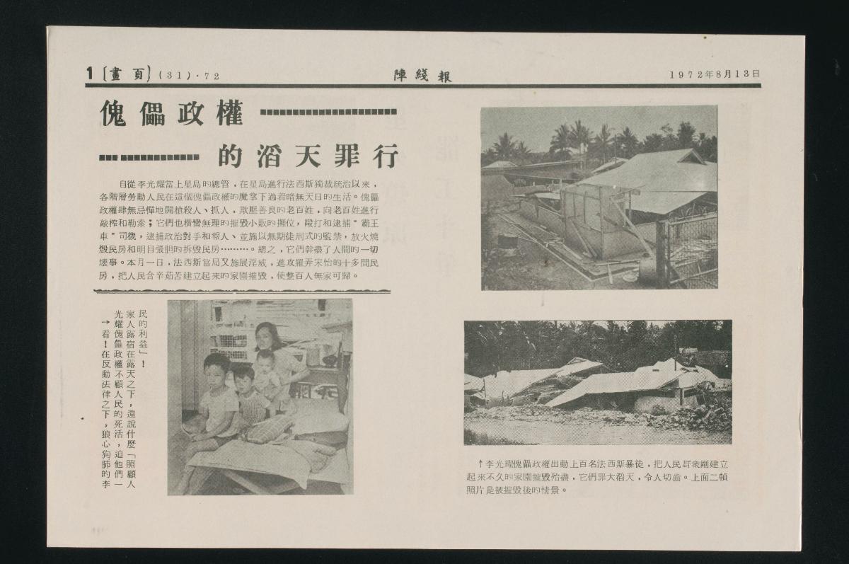 The Barisan Sosialis (Socialist Front) was a political party formed in 1961 by the former left-wing members of the People’s Action Party (PAP). Barisan was led by Lee Siew Choh and Lim Chin Siong, and was the main opposition party in self-governing Singapore. In the 1963 General Elections, the party won 13 of the 51 seats contested. In the 1965 by-elections, the PAP had a decisive win over Barisan. The party boycotted the 1968 elections, only to contest in the1972 elections with no success. Barisan Sosialis eventually dissolved in 1988.
