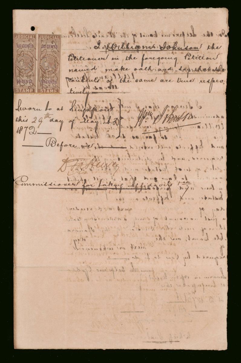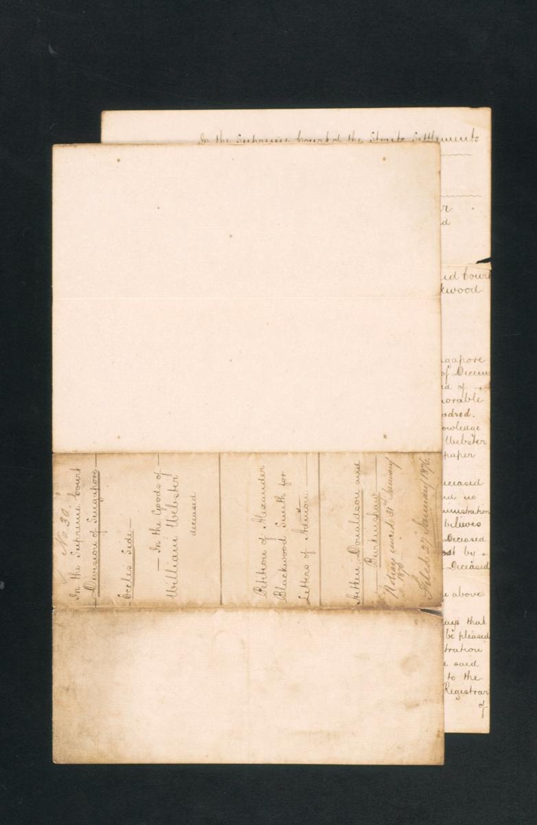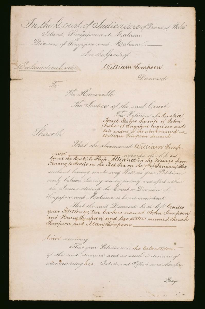 This is the petition filed by Alexander Blackwood Smith of Batavia concerning the administration of the estate of William Webster. It is part of a collection of legal documents from the 19th and early 20th centuries which provides a glimpse into the work of the notable personalities who left their mark on Singapore’s legal history, and the economic and other transactions undertaken by ordinary immigrants in 19th century Singapore that tell stories of misfortune and indebtedness which would otherwise have disappeared from history.