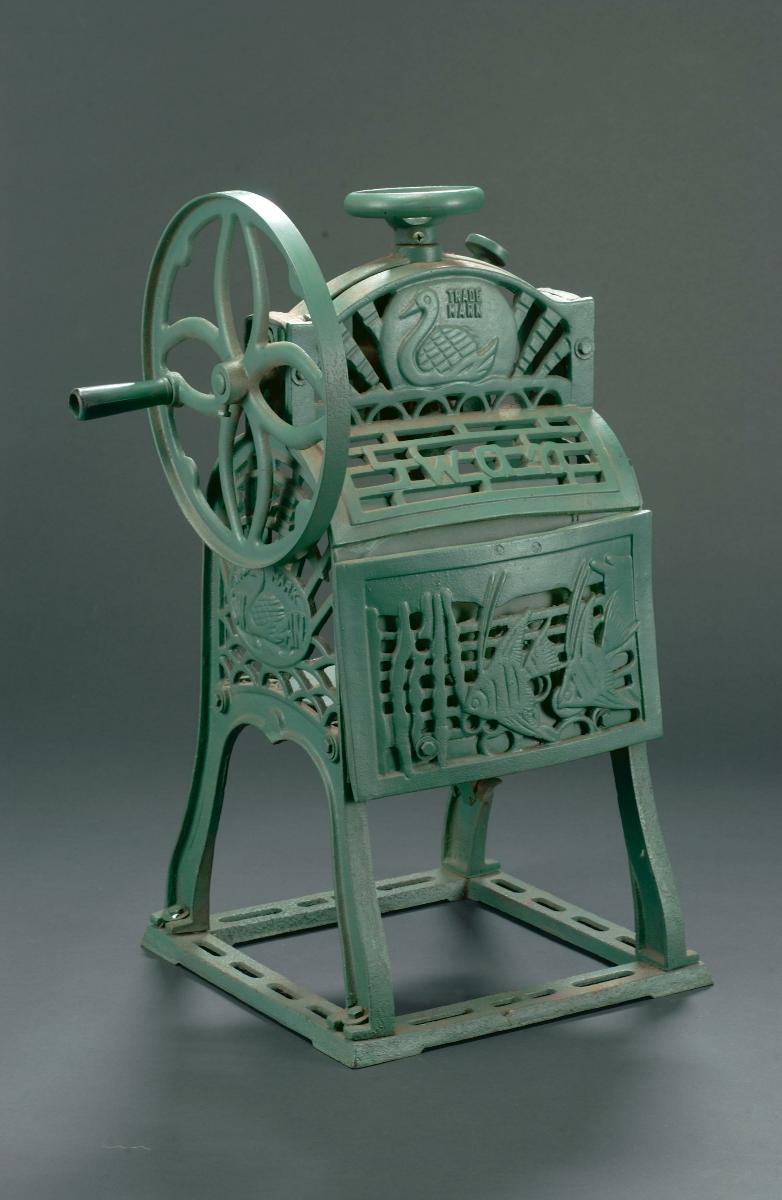 This manually-operated ice shaving machine was used to make ‘ice-kacang’, a popular dessert in many south-east asian countries. A block of ice would be clamped in place. After which the lever would be released and turning the handle of the wheel would shave the ice.Ice-kacang literally means ‘shaved ice with beans’. The traditional ice-kacang usually contains ‘attap-chee’ (palm seed), red beans, sweet corn, agar agar and cendol which are jelly-like ingredients and the mountain of shaved ice is drizzled with condensed milk and other dressings. In the 1950s and 60s, when not as many choices of desserts were available, a bowl of ice-kacang was cheap and had an excellent cooling effect on a hot sunny day.