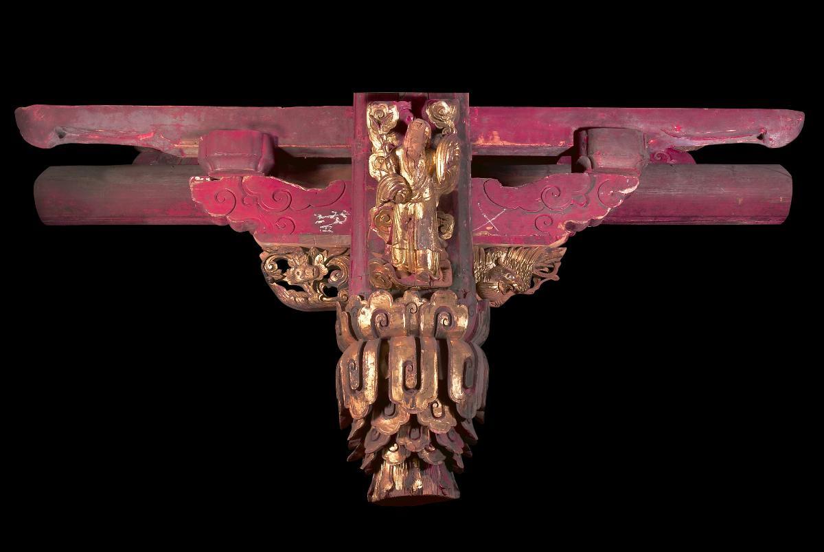 This wood-carved wall bracket comprises an openwork floral panel. It is much like a lattice-work screen, but uses the running flower motif. It is framed by ornate columns from which spring 'makara torana' - arches in the shape of a mythical animal. The torana is surmounted by Gajalakshmi (Goddess Lakshmi with elephants).Elements from several schools of sculpture are borrowed in the making of this single bracket. The meandering floral design of the back draws inspiration from the exquisite floral windows of the Sidi Sayyid mosque (1527 CE). The columns and the arrangement of motifs on them in circular bands draw from Jaina temple architecture. The torana too is based on Jaina architecture as seen in the temples of Dilwara abd Ranakpur in Rajasthan in western India.