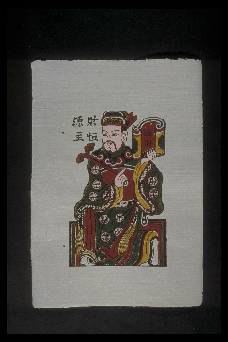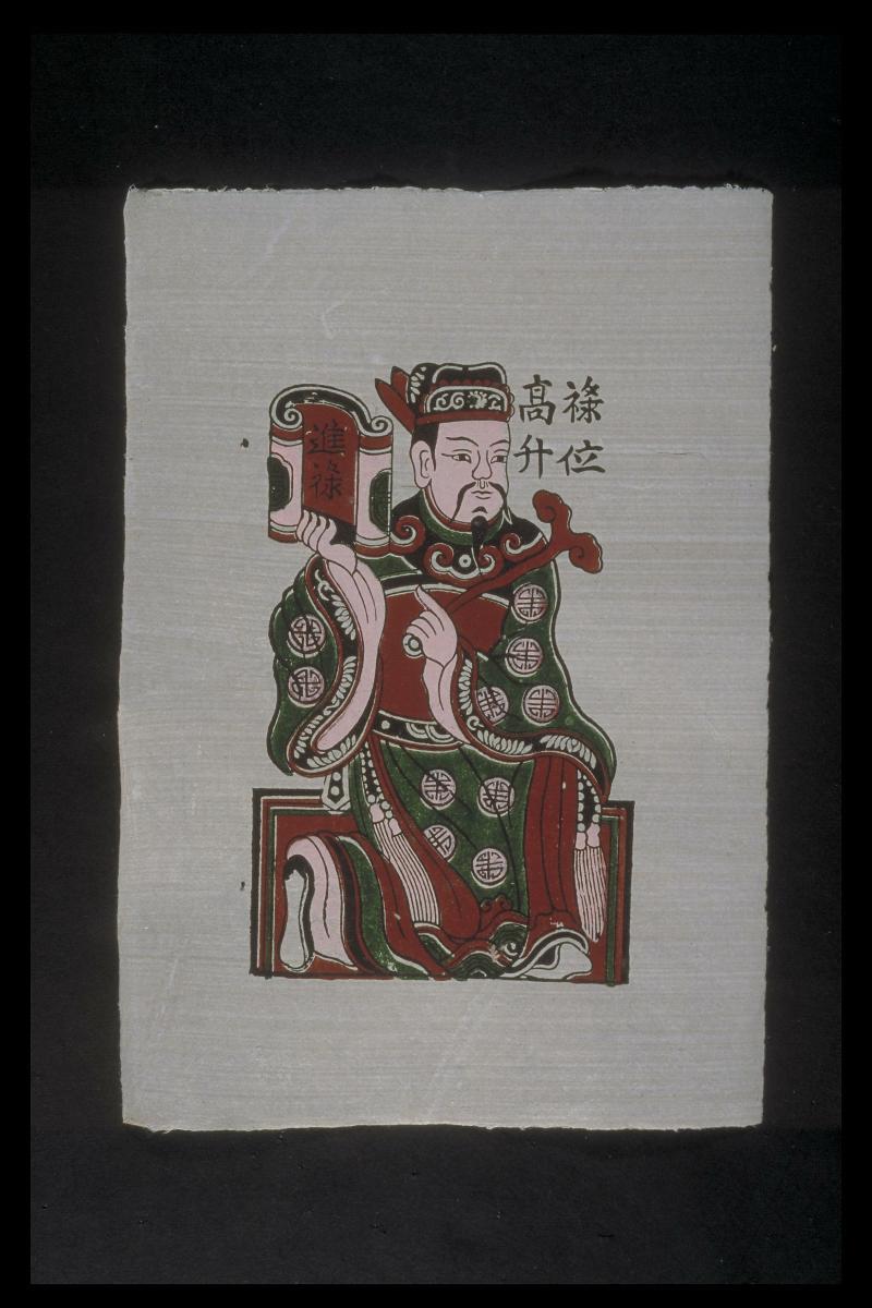This print is made on handmade mulberry paper using a woodblock and inks, which are coloured with natural materials such as red, made from the mineral cinnabar and black, made from burnt bamboo leaf. The inks are mixed with crushed oyster shells to give thickness and a shiny finish. Sometimes a wash of oyster shell is painted on to the paper first to create a pale ground against which the colours are overlaid. The range of subject matter in woodblock prints reflects the rich cultural life of Vietnam. They include a wide repertoire of images and stories, including depictions of auspicious festive activities, protective door guardians, local deified heroes, episodes from popular legends and many more. Images of deities that represent longevity, health, and wealth such as this one, are usually displayed during Tết, the Vietnamese New Year.