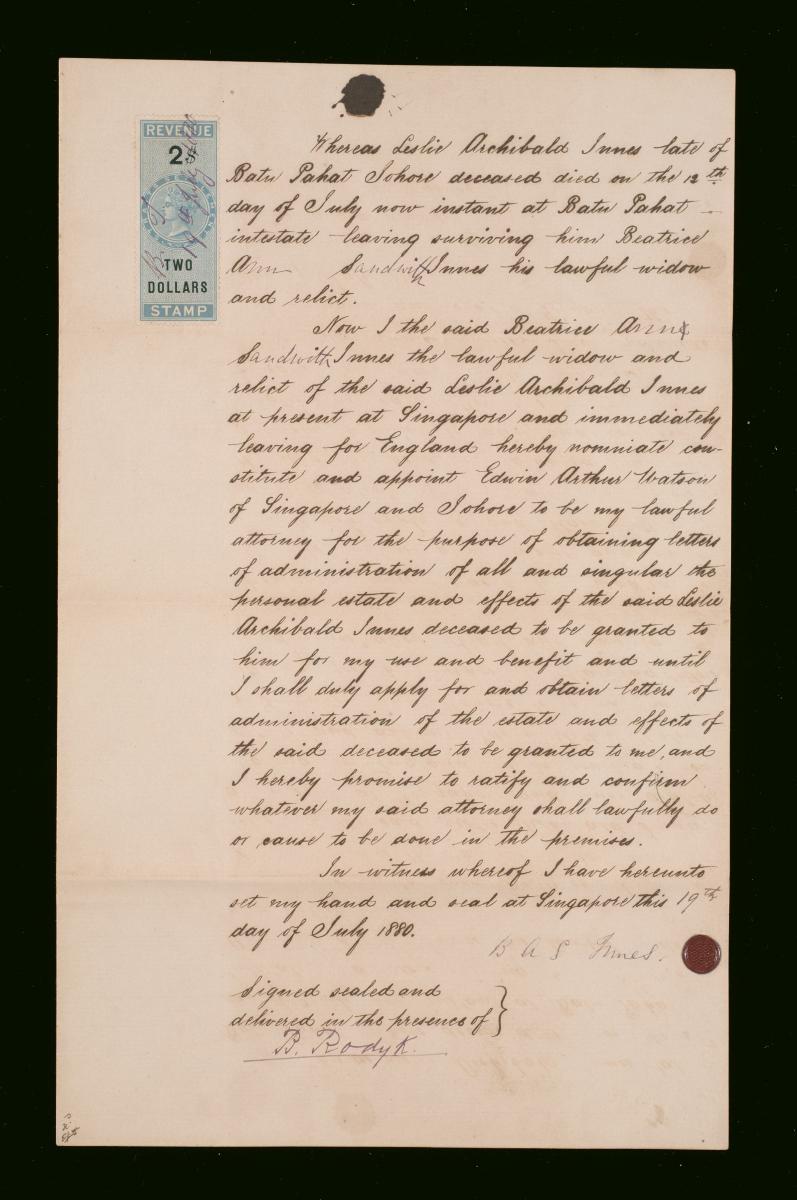 This is a power of attorney issued on 21 September 1917 by Robert Campbell Edwards to John Charles Peter, John Scrywgeoue, Alexander Ichesen Warrack, W.D. Mcbullagh, V.M. Grayburn, H.C. Aspindll, and all of the Hong Kong and Shanghai Banking Corporation of Singapore. He was residing in Nagasaki, Japan at the time of writing. The appointees were authorised to apply to the Supreme Court of the Straits Settlements in Singapore on behalf of Edwards for the letters of administration of the estate of his late wife, Helena Deborah Louise Edwards, who died interstate in Nagasaki on 1 March 1917. Once these letters of administration were obtained, they were required to administer her estate and to collect all possessions belonging to his wife. This document is part of the John Koh collection which comprises of various legal documents in Arabic, Jawi, and English, and serves as a record of the 19th and early 20th century colonial legal systems in Singapore and the interactions of various ordinary individuals with the law.