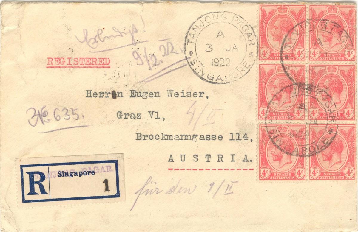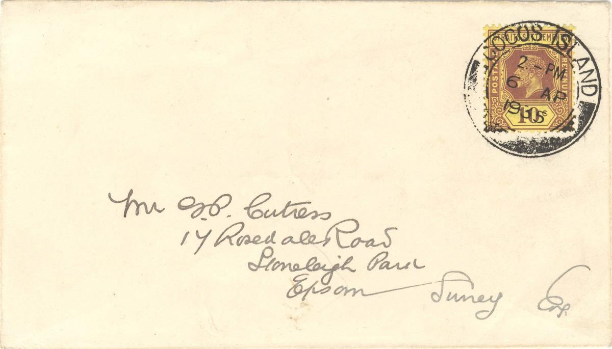 Cover sent to United Kingdom bearing King George V 1912-33 10-cent bright blue stamp (Die I) and 6-cent claret.