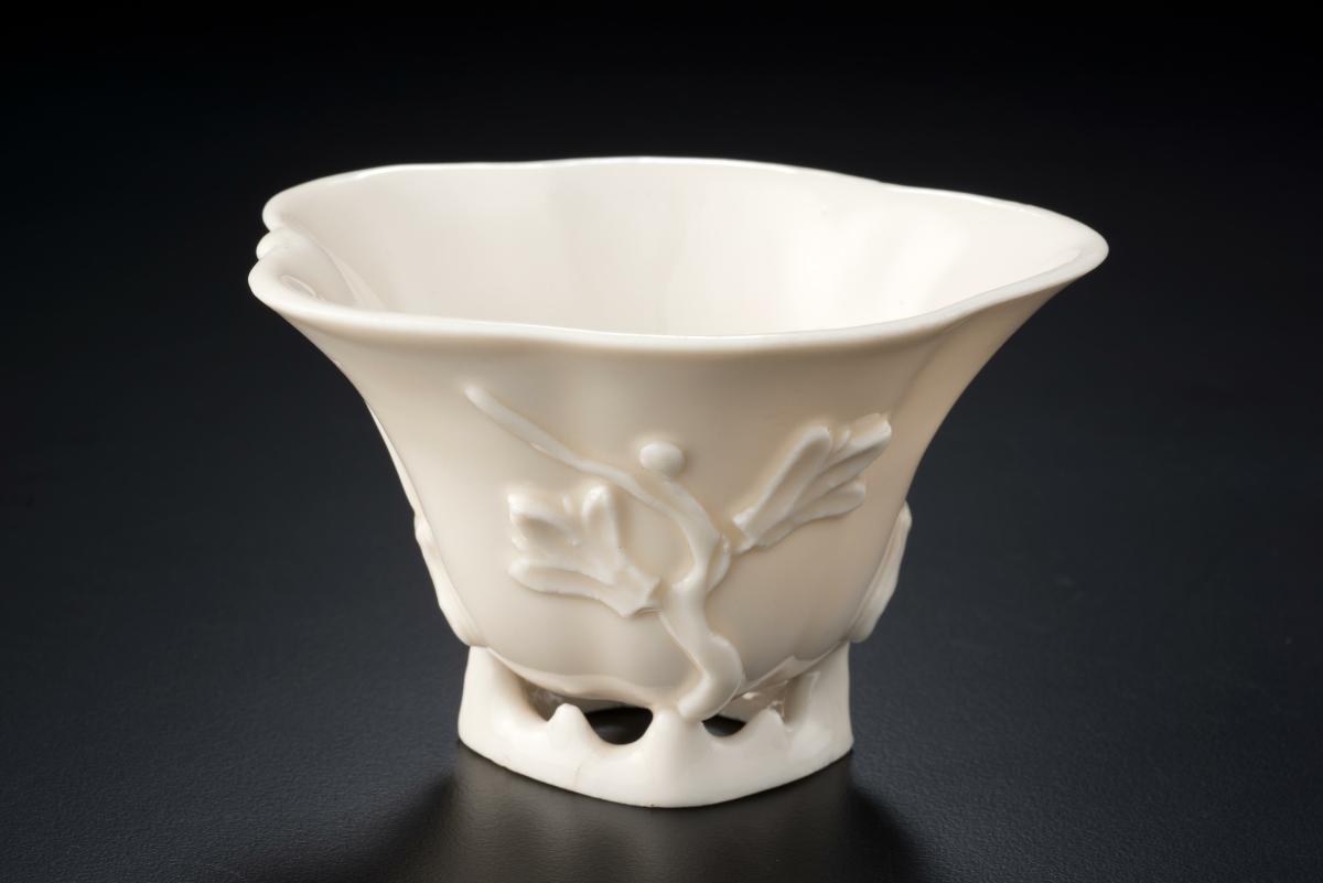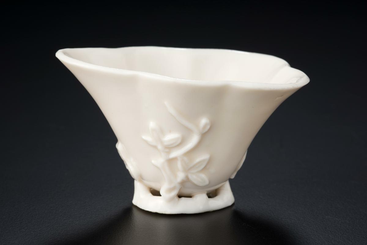 These cups appear to be a variation of the magnolia blossom cups in that the rim is extended to one side, giving the impression these could have been pouring vessels. Perhaps stylised Dehua cups like these examples take their form from a carved horn prototype (see 2000-03356).Dehua, located on the southeast coast of Fujian province, is well known for its production of white porcelain, known to Europeans as 'blanc de Chine'. The earliest Dehua porcelain was produced as early as the 14th century but the production and quality of these porcelain peaked around the 17th and 18th centuries.