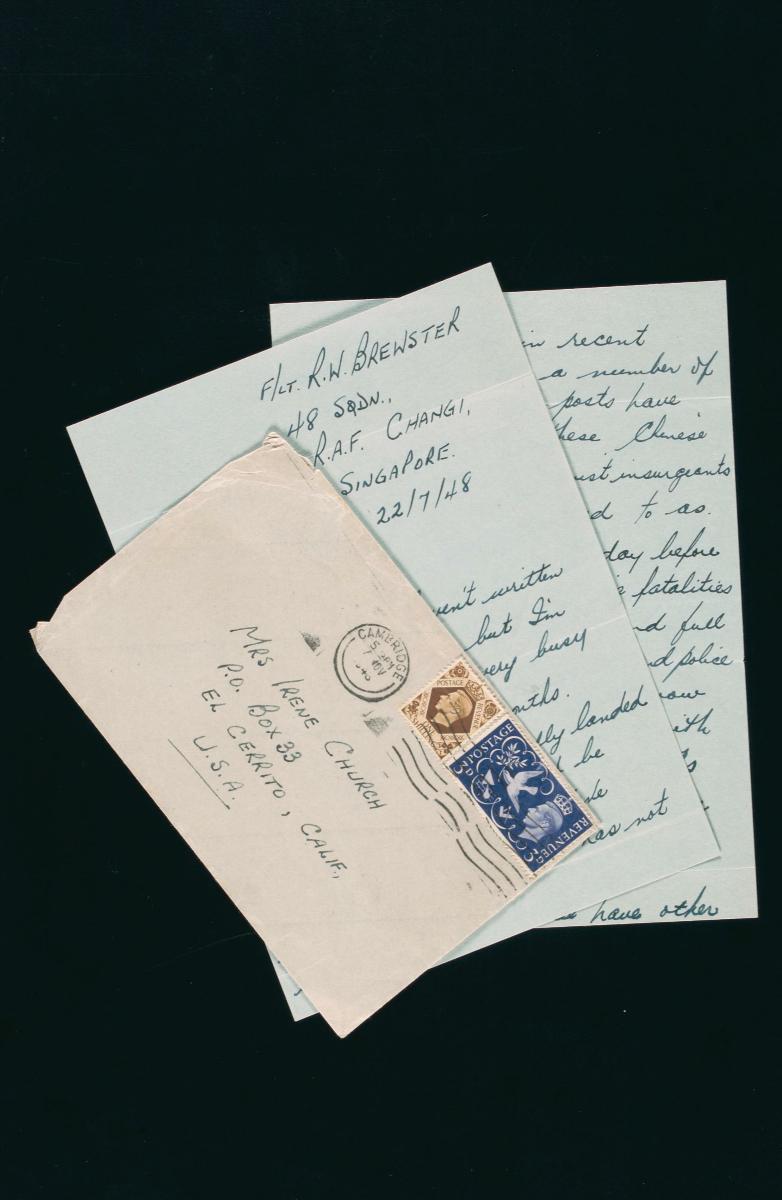 A hand-written letter dated 22 July 1948 from Flight-Lieutenant R.W. Brewster of the Royal Air Force (RAF) 48th Squadron, based at RAF Changi, to Mrs. Irene Church in California, USA. It was written at the beginning of the Malayan Emergency and captured the moment when the Emergency became violent.
