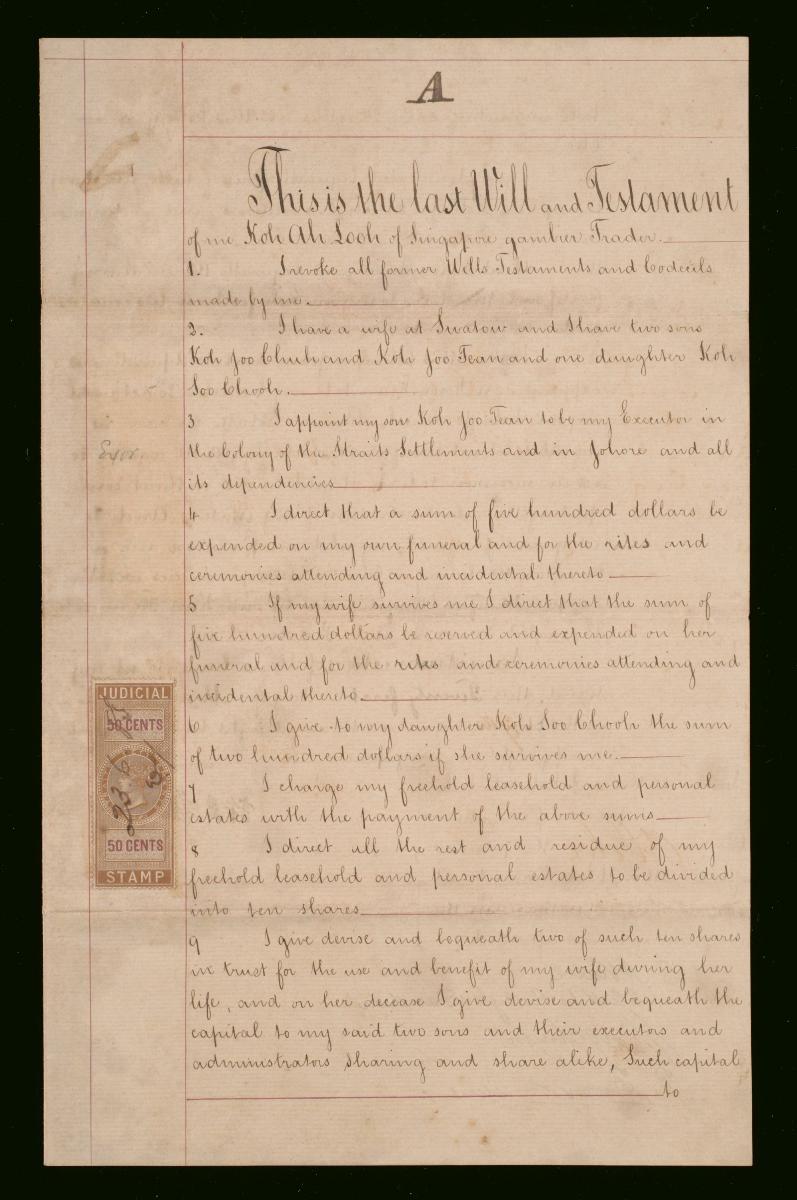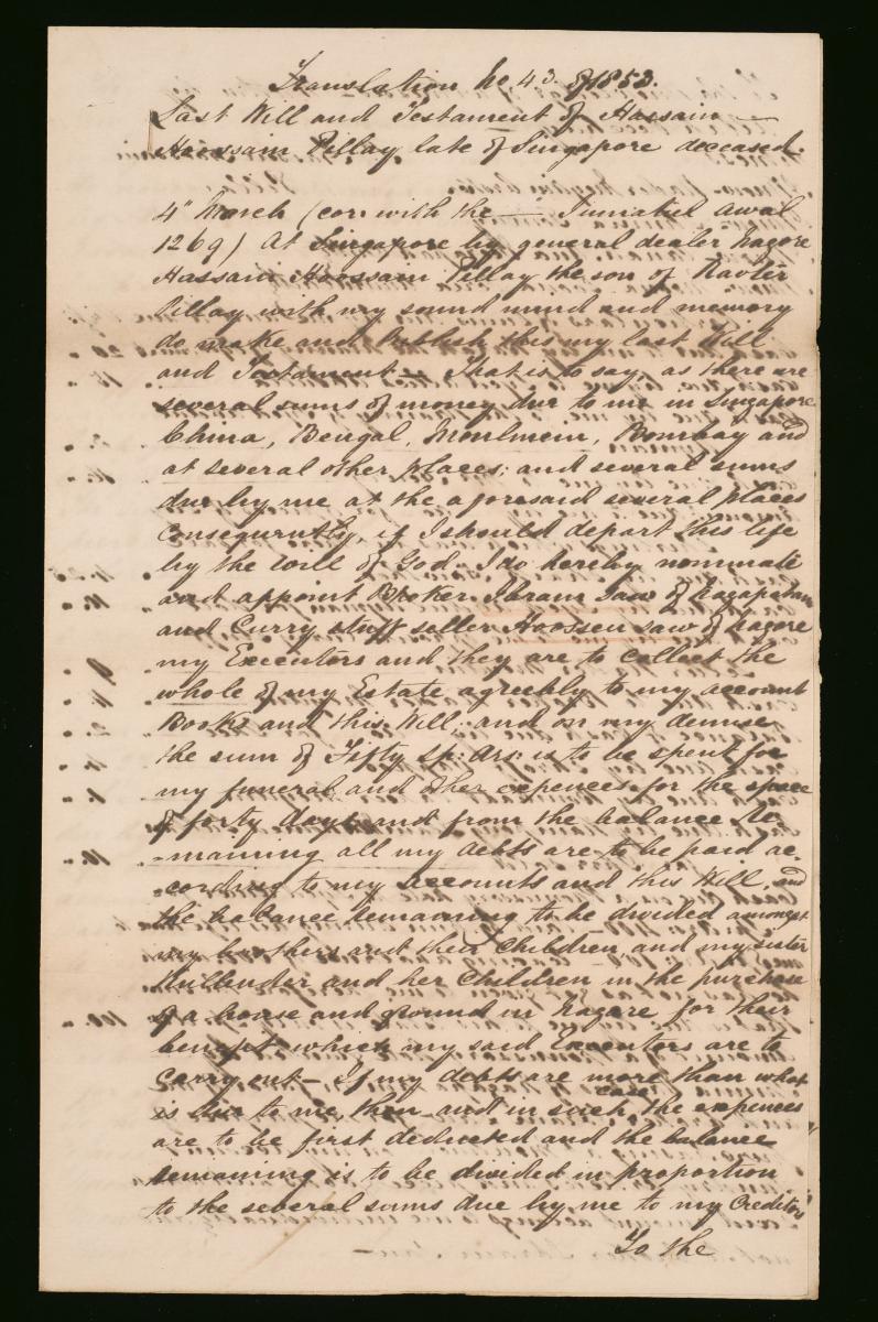 This is an English translation of the last will and testament of Mah Hussan Bedau, which was written by Inchy Osman on her behalf and published in Singapore on 15 January 1862. It was translated from Malay to English by the Singapore Translation Office on 27 July 1865. Mah Hussan Bedau bequeathed her house and the lot of land to her four heirs: her husband, Abdul Rahman, her son, Hussain, and her two adopted children, Abdulla and Nouriah. The house was located at Tanjong Paggar Road beside the house of Ahminah binte Iwawdi and at the foot of the hill belonging to Syed Abdulla Junied. She specified that they were forbidden from selling the house though they could always reside in it and if repairs were required, the cost was to be borne by all four of them. She had mortgaged the deeds of the house and land for a sum of 100 dollars to Ramsamy Chitty, at the interest rate of two dollars per month. She gave her heirs the choice of paying for the interest and bequeathed the contents of the house to them. Her marriage dower was to be given to her husband, Abdul Rahman. This document is part of the John Koh collection which comprises of various legal documents in Arabic, Jawi, and English, and serves as a record of the 19th and early 20th century colonial legal systems in Singapore and the interactions of various ordinary individuals with the law.