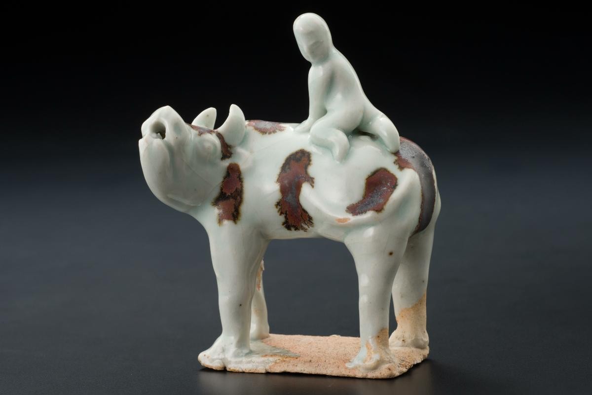 This miniature seated figure of a boy is a simply moulded piece with little or no hand-finishing. The holes on each side of the head and at the back of both shoulders suggest that this piece was intended to be a water-dropper. A mix of Chinese and Western attributes, in this case the ruyi sceptre held up to one shoulder and the Western style buttoned tunic with wide collar, are typical of these small pieces for export to Europe. Children were depicted in Chinese art from as early as the Eastern Han (25-220 CE) and Tang (618-906 CE) periods, but more so from the 10th century onwards. The auspiciousness of such images has been interpreted as having a two-fold reading; one that they originate from images of reborn souls seated on lotus flowers in Buddhist paradise scenes, the other that they symbolise fertility and the desire for male off-spring.Dehua, located on the southeast coast of Fujian province, is well known for its production of white porcelain, known to Europeans as 'blanc de Chine'. The earliest Dehua porcelain was produced as early as the 14th century but the production and quality of these porcelain peaked around the 17th and 18th centuries.