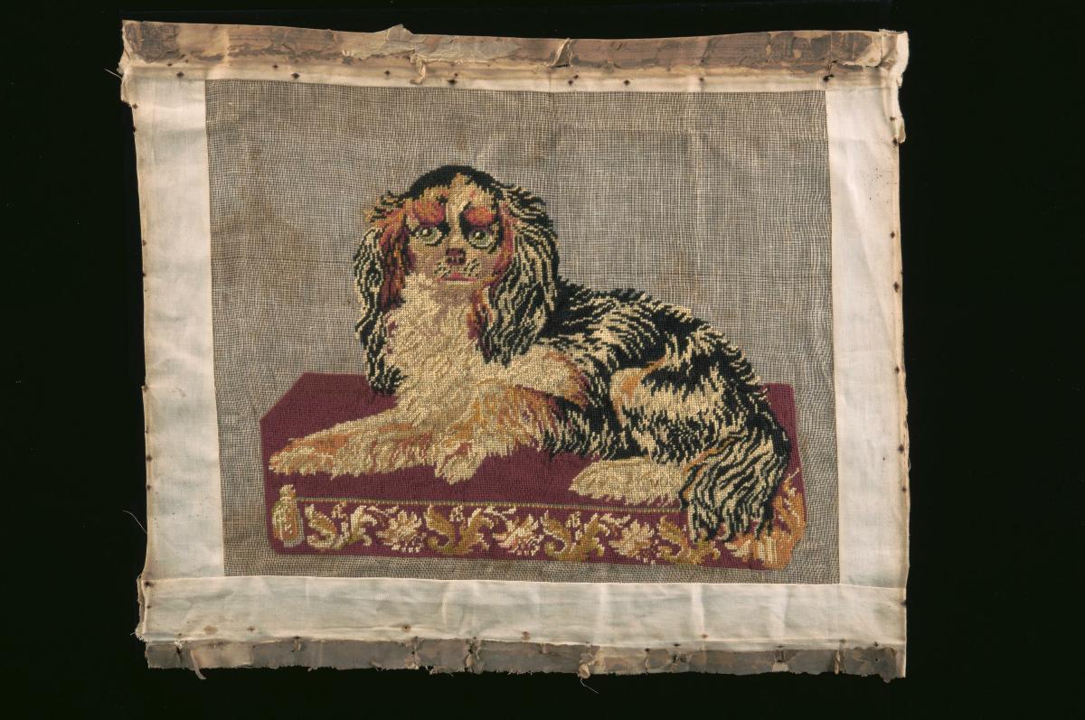 This is a piece of cross-stitch embroidery showing a dog in a forest.The artefact is part of a set of twelve unique pieces of cross-stitch embroidery and beadwork sewn on even weave fabric with cotton cloth backing. These pieces were created by children, as reflected in the vibrant and colourful motifs of flowers, animals and human characters.The Peranakan Nonyas were required to learn beadwork and embroidery at a very early age as their desirability as potential brides was dependent on possessing such skills. Beadwork and later embroidery skills were used for making handkerchiefs, slippers and purses. Apart from the Nonyas, many local-born Chinese girls from the pre-war era to the 1970s also strived to acquire embroidery and beadwork skills. Sewing and handicrafts were in fact an important part of the lower primary school curriculum for girls.