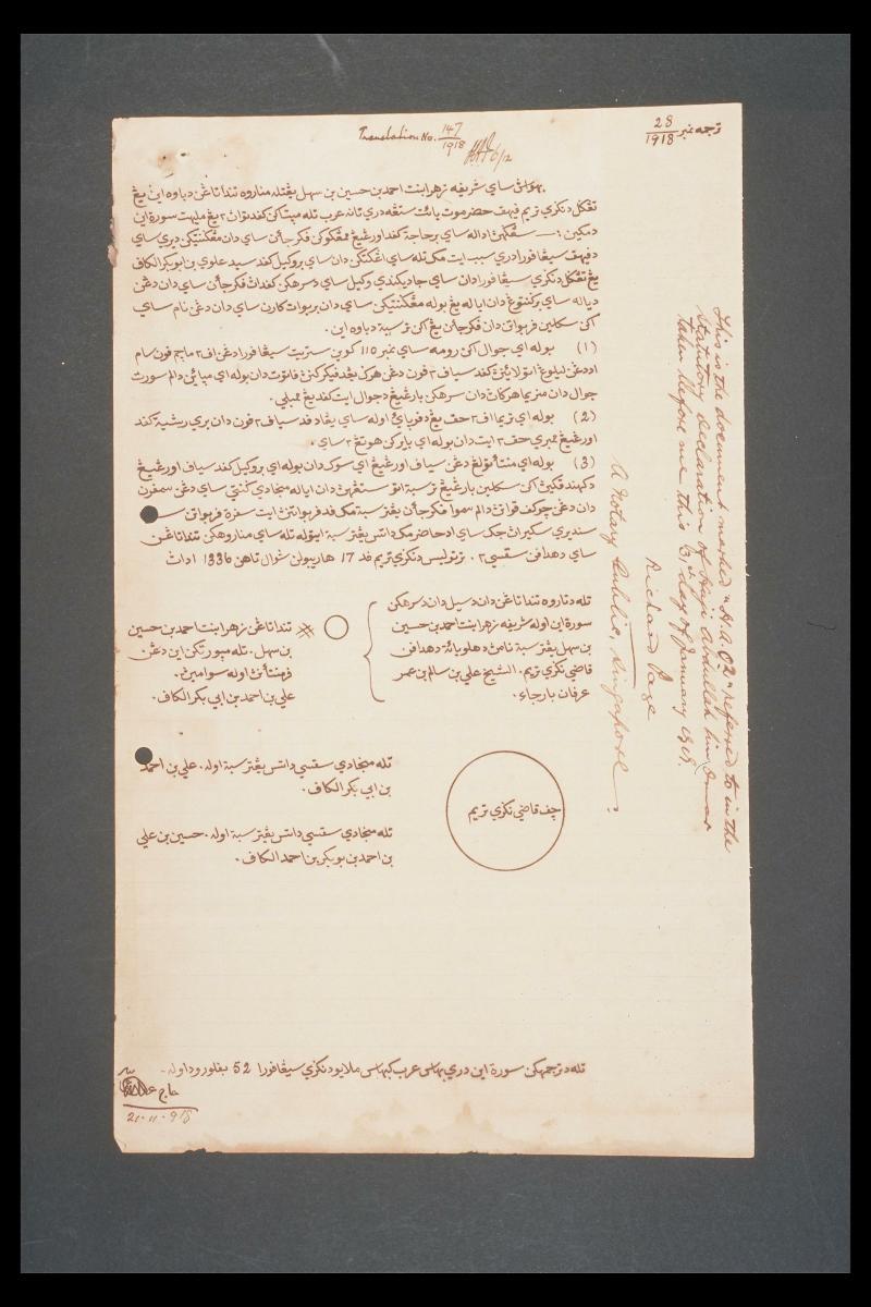 This is an English translation of the power of attorney granted by Ghaida binte Sallim bin Hadi on 29 May 1915. It was issued to the sons of Hadi bin Ali bin Ahmed Altui Ba Salamah, Mahfooth bin Ali bin Ahmed Altui Ba Salamah, Omar, and Sallim, as well as the sons of Ahmed bin Ali bin Ahmed Altui Ba Salamah, Abdullah and Ali.They were authorized to hold, look after, and keep all the share to which Ghaida was entitled to as one of the heirs in the estate of her son, Abdul Rahman bin Taib bin Ali bin Ahmed Altui, who died in Shibam, Hadhramaut on 14 May 1915. Ghaida was entitled to one sixth of the share of all the estate owned by Abdul Rahman in Shibam and Mukalla, consisting of houses and immovable assets such as plantations and date trees, as well as movable property such as cash and outstanding debts. Ghaida was also included in her son’s share of the property in Singapore, comprising of houses No. 178 at Rochor Road and No. 92 at Arab Street, along with her share in the estate of his brother, Ali bin Taib, of houses No. 17 on Chin Chew Street and No. 177 on Rochor Road. This document is part of the John Koh collection which comprises of various legal documents in Arabic, Jawi, and English, and serves as a record of the 19th and early 20th century colonial legal systems in Singapore and the interactions of various ordinary individuals with the law.