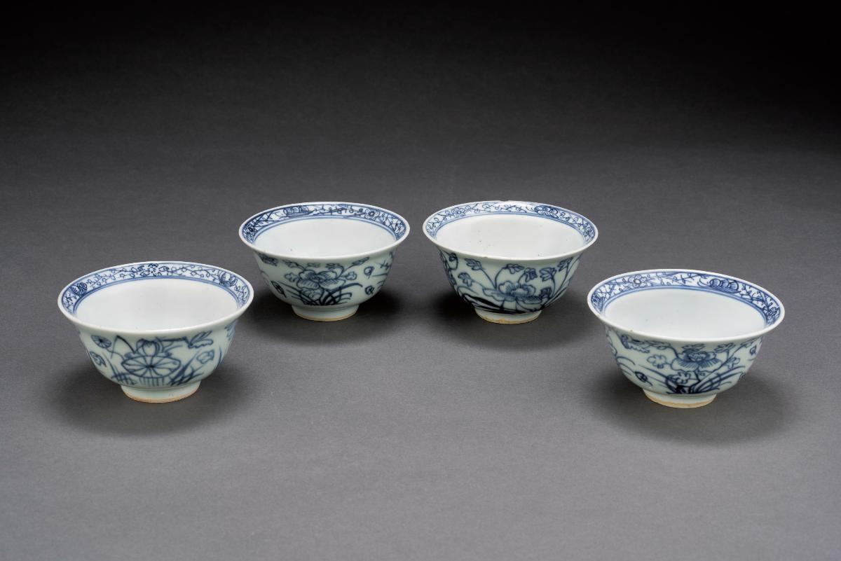 These cups have fluidly moulded forms comprising finely delineated flower petals, and a stem that curls around the base with four small feet, and rises handle-like up the side. The creamy pinkish toned glaze enhances the delicate forms. These pieces have more recently been dated to c.1640.Dehua, located on the southeast coast of Fujian province, is well known for its production of white porcelain, known to Europeans as 'blanc de Chine'. The earliest Dehua porcelain was produced as early as the 14th century but the production and quality of these porcelain peaked around the 17th and 18th centuries.