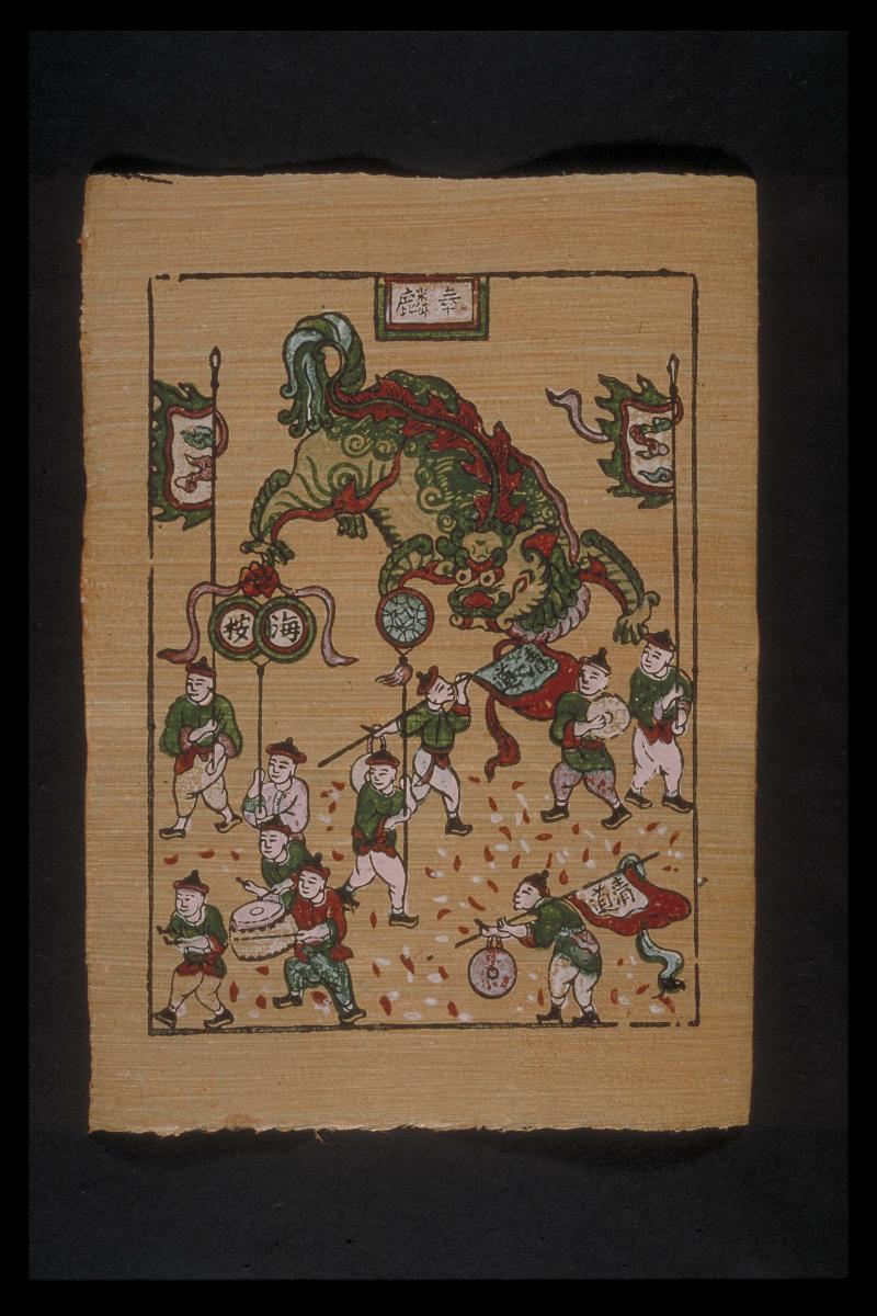This print is made on handmade mulberry paper using a woodblock and inks, which are coloured with natural materials such as red, made from the mineral cinnabar and black, made from burnt bamboo leaf. The inks are mixed with crushed oyster shells to give thickness and a shiny finish. Sometimes a wash of oyster shell is painted on to the paper first to create a pale ground against which the colours are overlaid. The range of subject matter in woodblock prints reflects the rich cultural life of Vietnam. They include a wide repertoire of images and stories, including depictions of auspicious festive activities, protective door guardians, local deified heroes, episodes from popular legends and many more.The cockerel represents Van (cultural learning), Vu (knowledge of martial arts), Dung (bravery), Nhan (goodness), and Tin (dependability). According folklore, the cry of the cockerel rescued a household against evil spirits and demons ensuring the occupants' happiness.