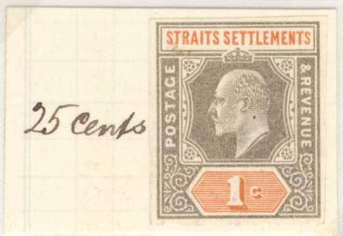 Imperforated colour trial of King Edward VII Straits Settlements 50-cent stamp.