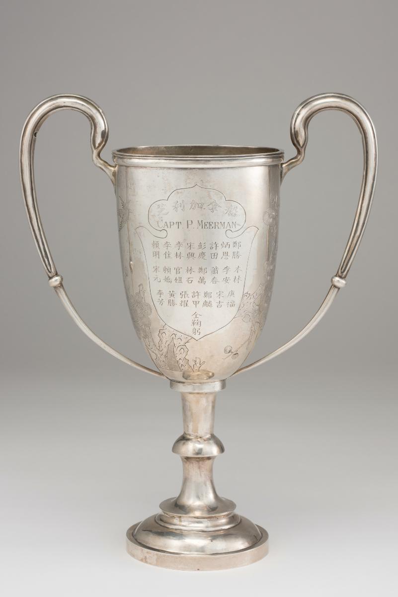This lobed cup has moulded flower petals rising from a base with four feet in the form of various flora and fauna (e.g. lotus buds, crab, snail). A robed figure standing at the centre with a fly whisk is probably Lu Dongbin, one of the Eight Immortals who represents scholars. A hole at the base of the figure connects to a hole at the base of the cup. These have been called ‘trick’ cups, or 'gong dao bei' (literally 'don’t be greedy cup'), as wine was apt to drain onto the lap of the heavy drinker! This was confirmed in an experiment, where the cups immediately drained their contents when three-quarters full. An x-ray of the cup shows that the mechanism for this dramatic effect was a tubular spout inside the figure.Dehua, located on the southeast coast of Fujian province, is well known for its production of white porcelain, known to Europeans as 'blanc de Chine'. The earliest Dehua porcelain was produced as early as the 14th century but the production and quality of these porcelain peaked around the 17th and 18th centuries.