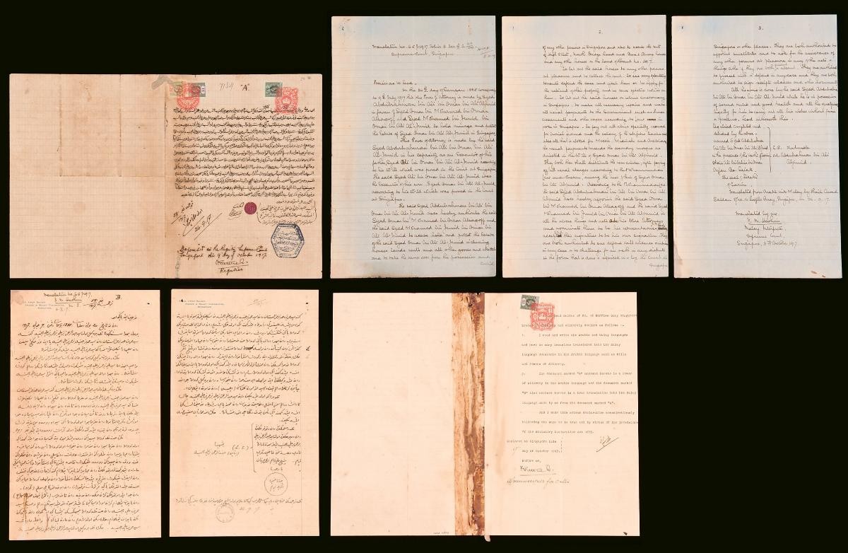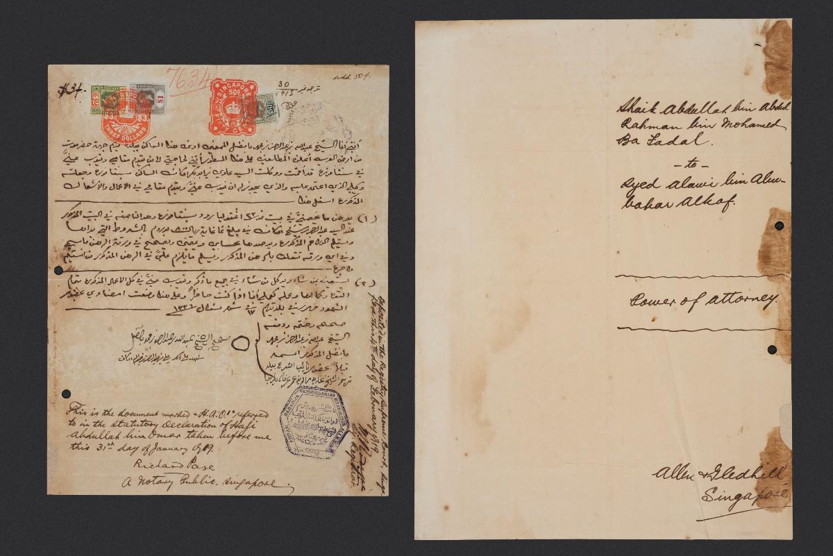 This is a set of documents related to the power of attorney issued by Syed Abdulrahman bin Abdullah Alkaf, Syed Hassan bin Abdulllah Alkaf, Syed Abdulrahman bin Shaik Alkaf, Syed Abubakar bin Shaik Alkaf, and Syed Abubakar bin Hussain Alkaf from Tarim, Hadhramaut on 21 April 1919. This set comprises of two translations in Malay and English of the original document written in Arabic. It was granted to Syed Alawi bin Abubakar bin Ahmed Alkaf for the purposes of obtaining the letters of administration for the estate of Sherifa Mariam binte Abdulrahman Alhuinduan, in their capacity as the executors of the estate of the deceased, who died in Tarim on 11 February 1919. These men were appointed in her last will and testament published on 23 January 1919. The power of attorney was verified and sealed by the Cadi of Tarim, Shaik Ali bin Sallim bin Omar Arfar Ba Raja. It was first translated from Arabic into Malay by Shaik Awad Saidan of No. 9 Lorong 14 off Geylang Road, Singapore, on 10 June 1919. It was subsequently translated from Malay to English on 24 June 1919 for use in the Supreme Court of the Straits Settlements, division of Singapore.This document is part of the John Koh collection which comprises of various legal documents in Arabic, Jawi, and English, and serves as a record of the 19th and early 20th century colonial legal systems in Singapore and the interactions of various ordinary individuals with the law.