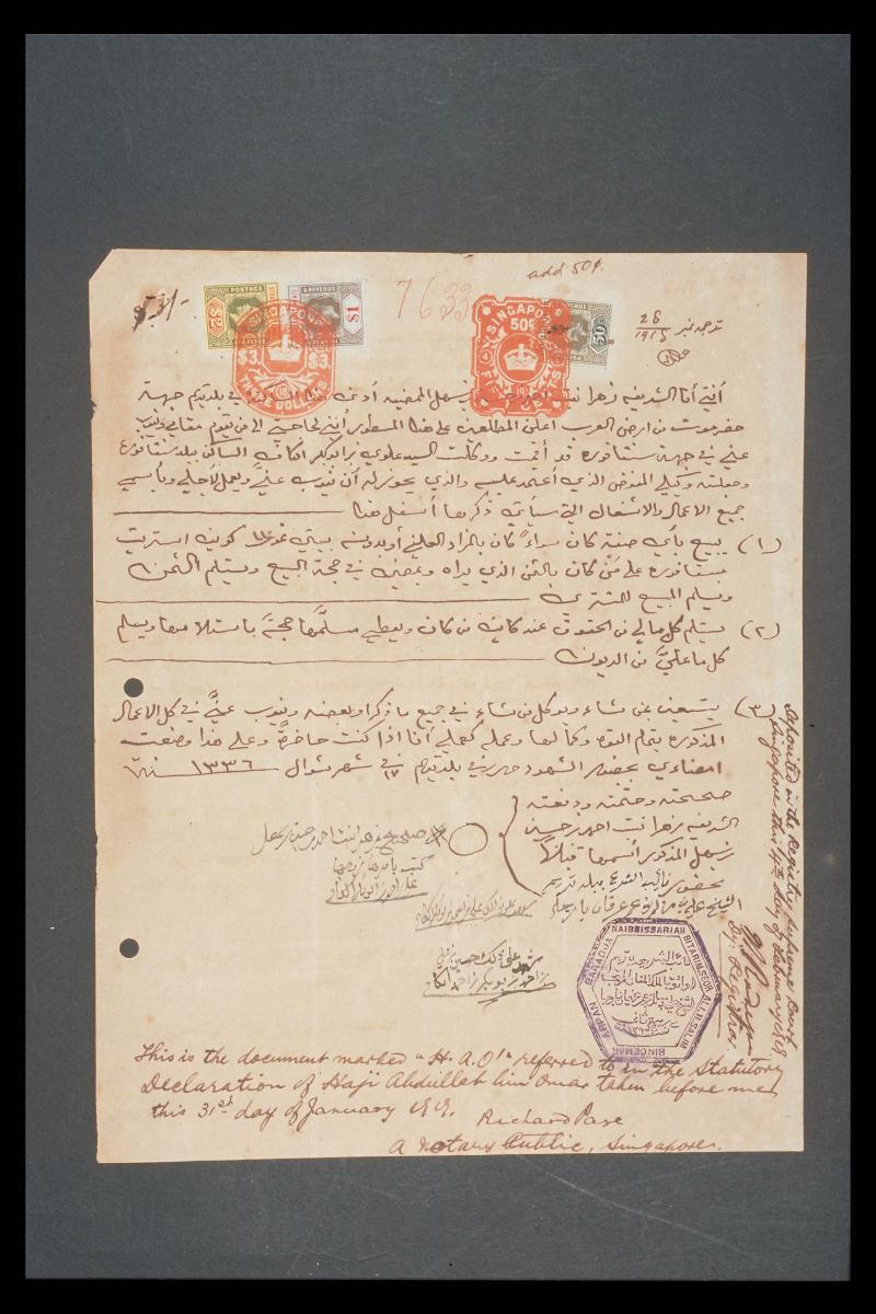 This is an English translation of the power of attorney issued on 26 July 1918 by Sharifa Zahara binte Ahmed bin Hussain bin Sahil of Terim in Hadhramaut to Syed Alawi bin Abubakar Alkaf of Singapore, who would manage her property and assets in Singapore. It was written by her husband Ali bin Ahmed bin Abibakar Alkaf on her behalf. Syed Alawi was authorized to conduct the following: to sell her house, No. 110 Queen Street, Singapore, by public auction or otherwise to any person for any price, to receive all properties belonging to her, to pay her debts, to solicit the assistance of any person, and to issue a power of attorney. This document was sealed by the Kadi of Terim, Shaik Ali bin Sallim bin Omar Arfan Ba Raja. It was first translated from Arabic to the Malay language by Haji Abdullah bin Omar of No. 52 Buffalo Road, Singapore on 21 November 1918. It was subsequently translated from Malay into English by the Malay interpreter of the Supreme Court of the Straits Settlements in Singapore on 6 December 1918.This document is part of the John Koh collection which comprises of various legal documents in Arabic, Jawi, and English, and serves as a record of the 19th and early 20th century colonial legal systems in Singapore and the interactions of various ordinary individuals with the law.