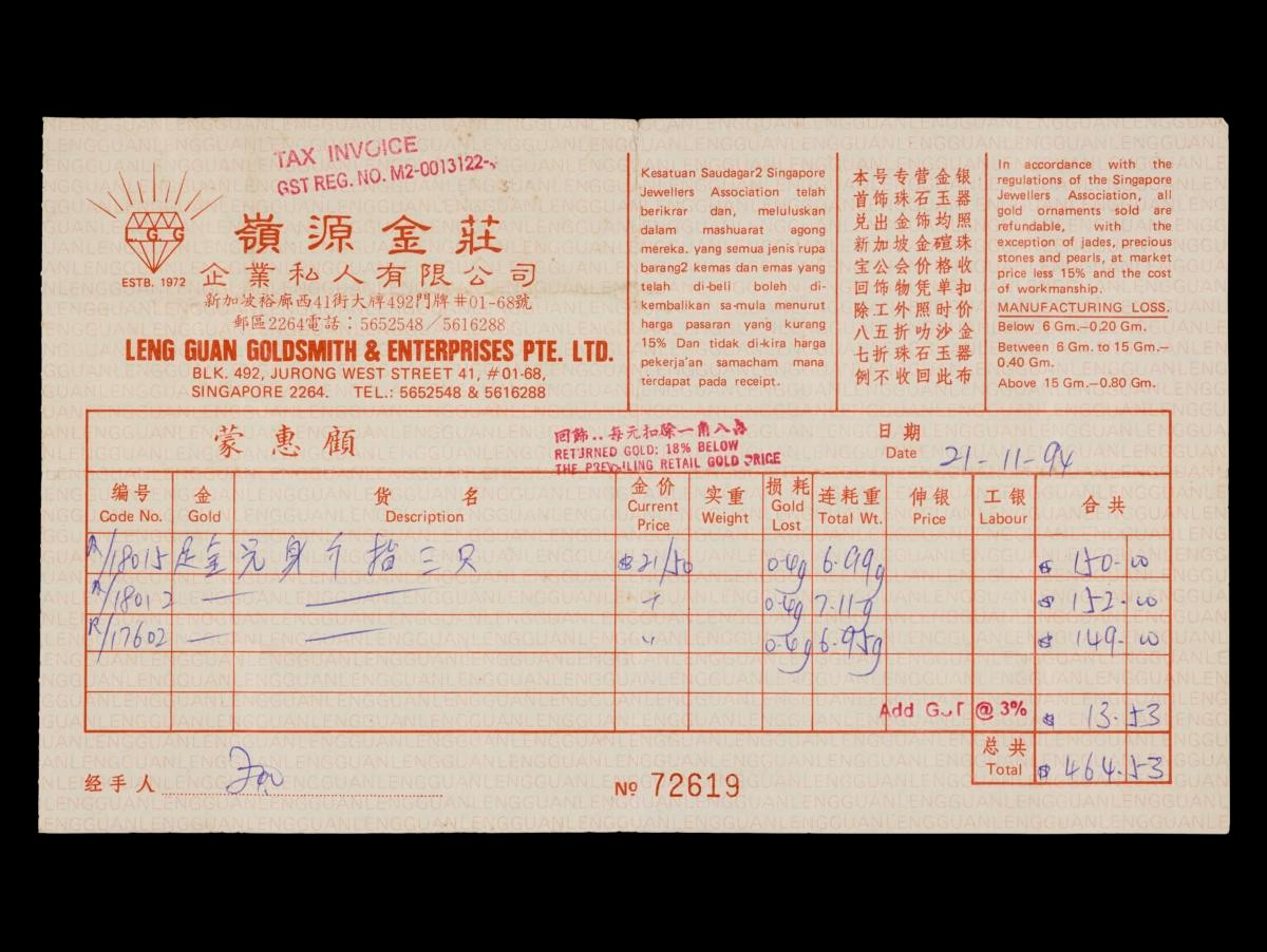 This is a receipt of payment to Goh Seng Leng (?), or otherwise called Panjang by other people at Tanjong Rhu. The payment was split over two occasions: the first payment was for $5 and the second payment was for $9.75.This document is part of the John Koh collection which comprises of various legal documents in Arabic, Jawi, and English, and serves as a record of the 19th and early 20th century colonial legal systems in Singapore and the interactions of various ordinary individuals with the law.